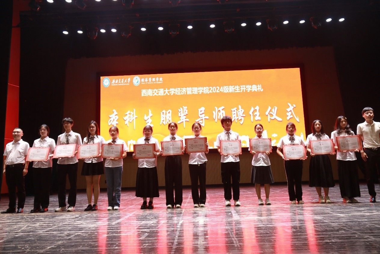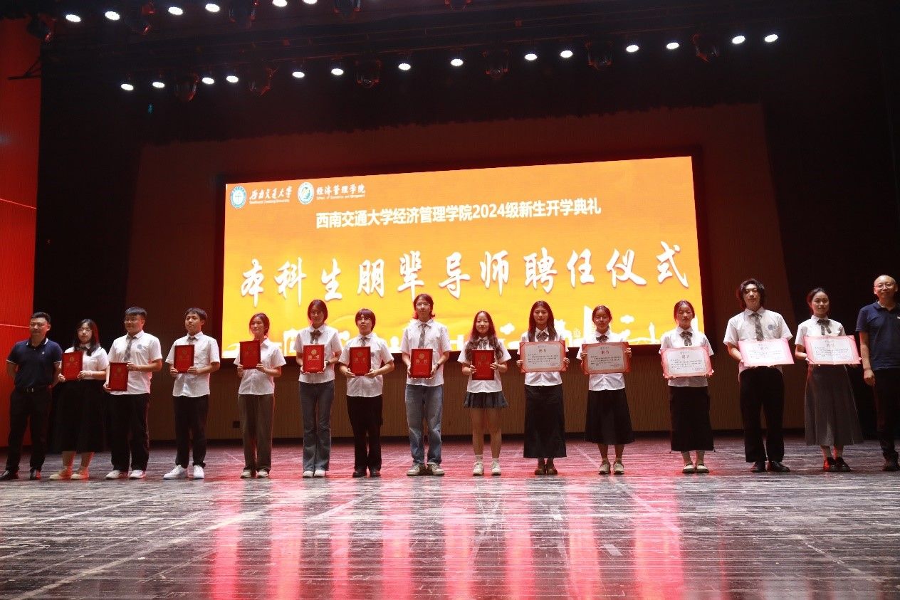 议程八,2024级本科生朋辈导师聘任仪式。引导同学,服务同学,晏理斌、聂佳佳、李良、马锋为二十八位朋辈导师颁发聘书,未来他们也将继续做同学们的好朋友、好榜样。