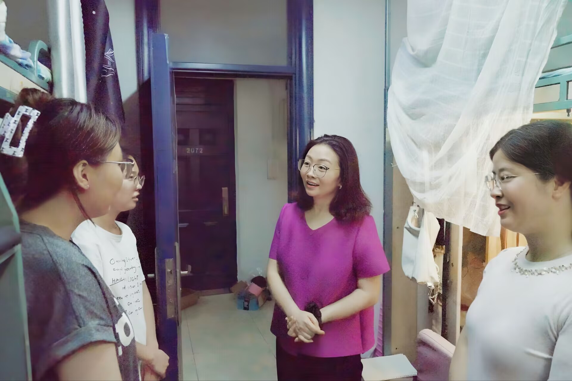 “离校手续办理到哪一步了?”“离校前还有什么困难?”“学习生活上对学校有什么意见或建议?”在眷诚斋十二栋三单元,老师们细致了解同学们的离校准备情况,认真倾听他们的所思所想、所盼所愿。楼道内,同学们向老师们分享收到毕业礼物的欣喜,并对学院的精心培养、悉心关怀感到非常暖心。