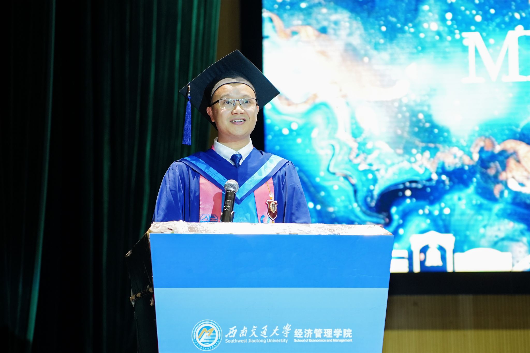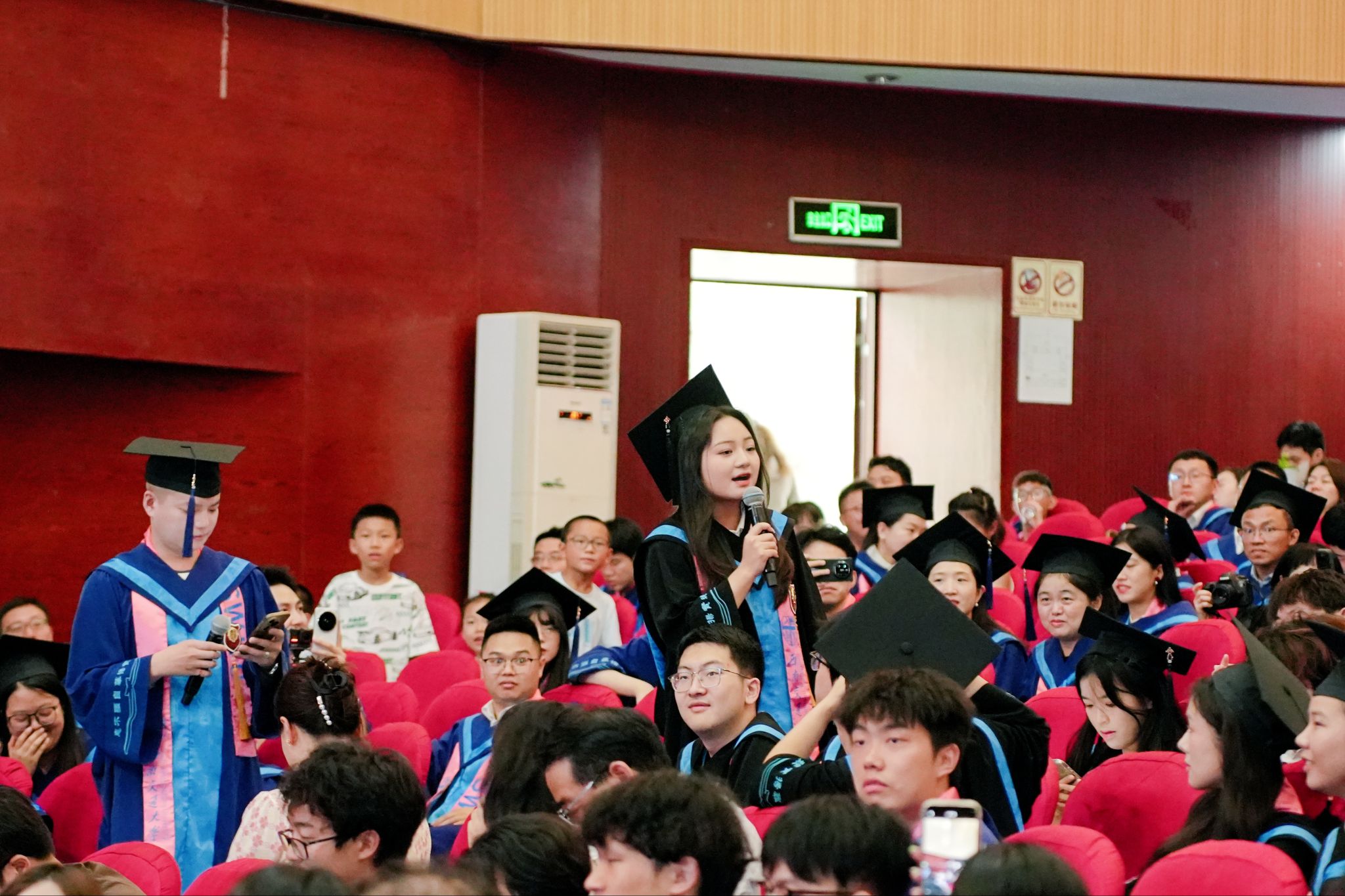 本科生毕业生代表毛宇欣、研究生毕业生代表李若晨、MBA毕业生代表张永恒分别发言。毛宇欣回顾了自己从懵懂到成熟的大学成长经历;李若晨分享了自己在硕士阶段学术研究、实践工作等方面获得的能力提升和成长;张永恒分享了自己奔走在课堂与职场之间的求学之路,不忘初心、拥抱挑战,在前行中连接彼此、照亮他人。毕业生代表真情实感的流露,饱含着对学院老师、同窗挚友的不舍与感谢。