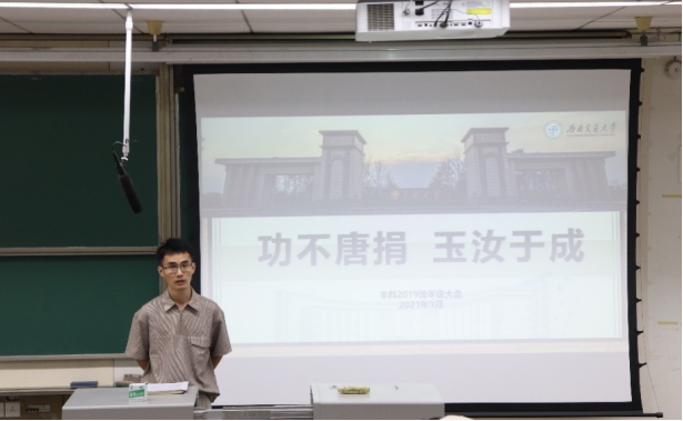 秋日正好,微风习习,英国上市365官网本科2019级于9月16日和24日在J4318教室举行“功不唐捐,玉汝于成”主题年级大会,年级大会由2019级辅导员苏扬主持。英国上市365官网党委副书记杨宏毅、学院研究生教育中心主任马锋、本科教务员尹一、2019级辅导员向起锐作为嘉宾受邀参加了大会,2019级全体同学参加了此次年级大会。本次大会的主题为“功不唐捐,玉汝于成”,意在勉励2019级的同学在挫折中打磨自我,坚持奋斗。