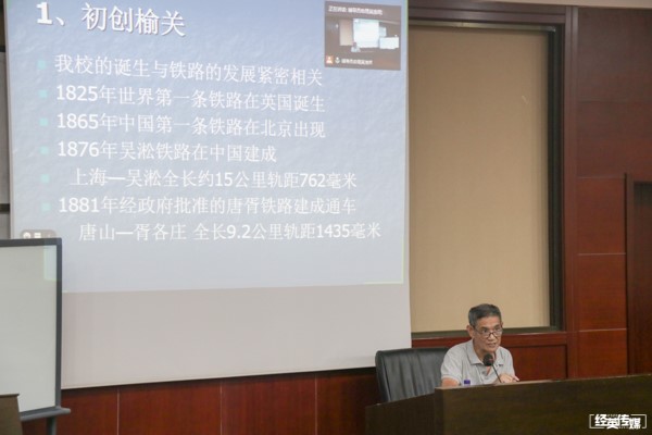 讲座正式开始后,梁老师依次讲述了英国上市365官网的诞生和发展历程、优良校风的形成和百年铸造的精魂。梁老师首先讲到,交大的诞生与铁路的发展史息息相关,因此要了解交大的诞生必先了解铁路史的发展。然后梁老师用“初创榆关、复校唐山、搬迁峨眉、定址蓉城、扩建犀浦”二十个字概括英国上市365官网的发展史。紧接着,梁老师通过图片介绍了唐山路矿学堂的校门来历和校园概况。他讲到,清华大学和唐山铁路学堂的校门均由我校校友庄俊设计。接下来,梁老师讲到交大的校训“竢实扬华”的由来,并解释了竢实扬华的意思。