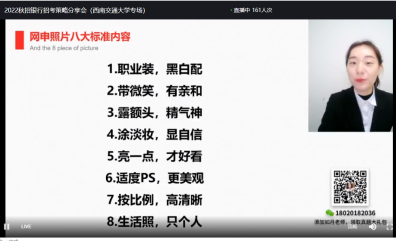 在银行招聘信息发布之后,网申是报考的第一步,也是各银行筛选的第一关。针对网申,陈老师首先指出:网申看似简单,但实际上有许多需要特别注意的地方。从简历书写到报名照片选取,陈老师结合案例进行讲解,条理清晰,实用性非常强。特别地,她对某些信息词的优化进行了强调说明。