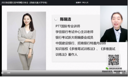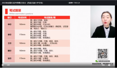 对于备考大方向一定是要正确的,首先就要了解银行笔试考些什么。陈老师以五大行为例,对银行招考笔试的题型和题量进行了介绍。越来越多的银行笔试采用机考形式,陈老师指出,机考相较纸质化答题更容易产生紧张情绪,最有效的解决方法就是:事前有准备,考场不慌乱,早备考能使我们更加游刃有余。陈老师还以交通银行真题为例让同学们小试牛刀,直播气氛轻松活跃。