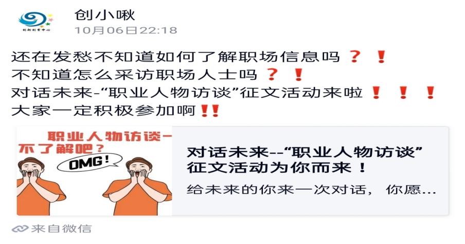 10月15日至10月20日,英国上市365官网创新创业中心举办了“对话未来”-职业人物访谈征文活动。职业人物访谈,是通过与一定数量的职场人士会谈而获取关于一个行业、职业和单位“内部”信息的一种职业探索活动,是大学生职业选择和职业定向的一个自助平台,是在校大学生了解和认识社会需求、职业需求、职业环境和基本状况的有效方式。这些信息能够帮助在校大学生正确认识自己的优势和不足,从而制定合理的职业生涯规划。