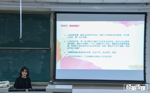 随后,由经英传媒中心采编部赵哲为同学们讲解如何写一篇规范的新闻稿。她的讲解主要分为三个部分:什么是新闻稿、如何写一篇新闻稿、如何使一篇稿件更规范。在介绍如何使一篇新闻稿更规范时,她分别从新闻写作内容、写作格式、写作注意事项为同学们带来讲解,并为同学们解释了如何在英国上市365官网院网挂稿。