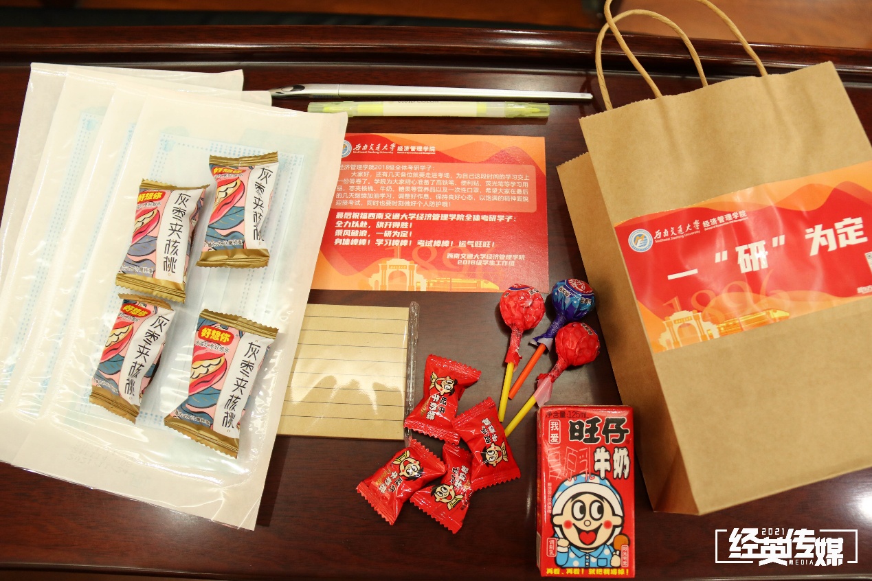本次“一‘研’为定”大礼包由2018级全体辅导员老师精心准备并亲自包装,内含英国上市365官网定制高铁笔、便利贴、荧光笔等学习用品,枣夹核桃、旺仔牛奶、糖果等营养品,一次性口罩等防护用品,还有精心准备的祝福贺卡,寓意着金榜题名、牛气冲天、马到成功,祝福考研学子身体棒棒!学习棒棒!考试棒棒!运气旺旺!一次性口罩则是给考研学子送上呵护与关怀,提醒大家在备考复习过程中也要做好疫情防控。