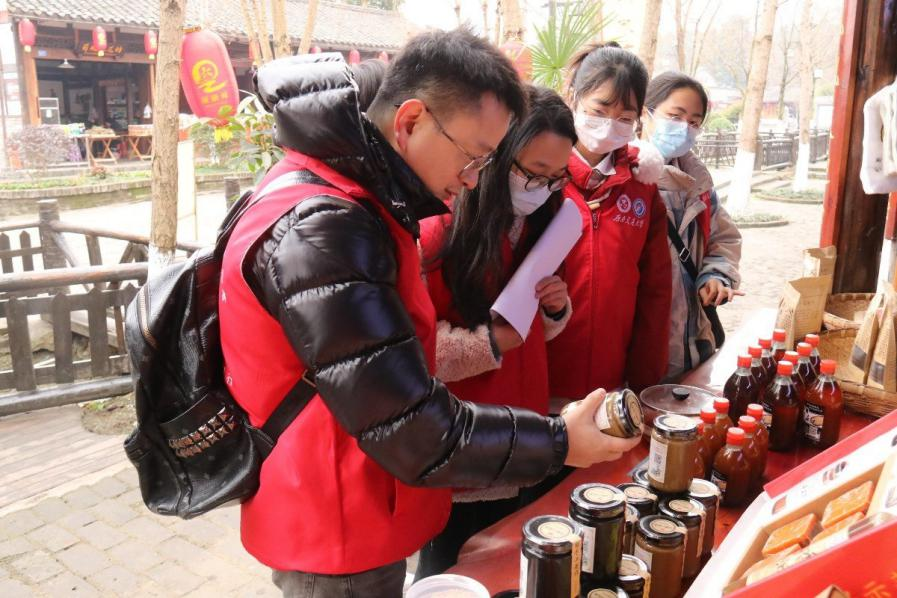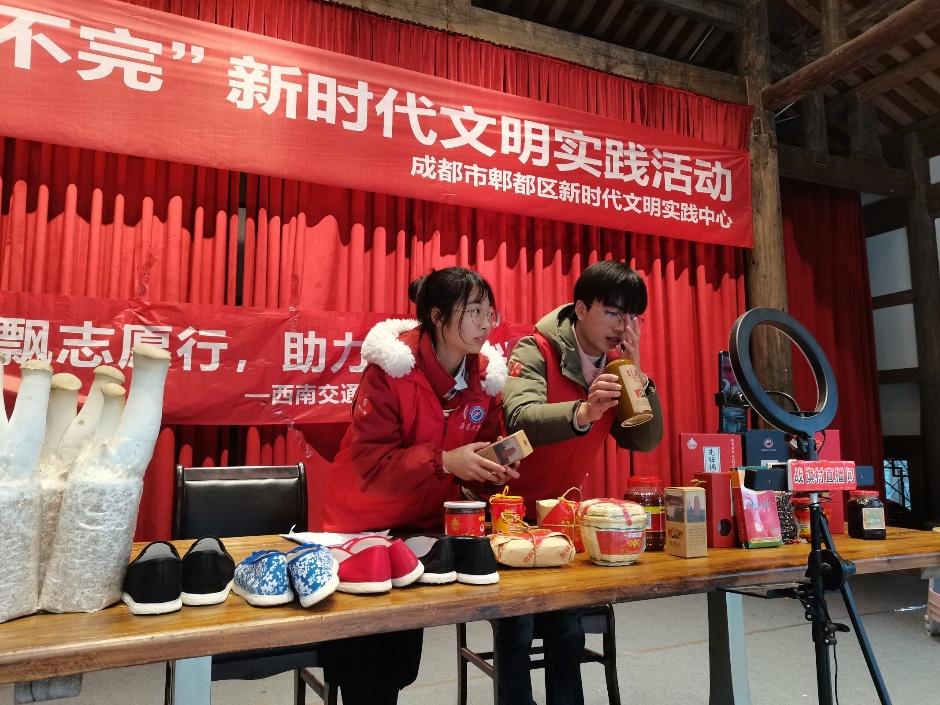 在这三天里,实践队先后参观了党建馆、村史馆、乡村十八坊、郫县豆瓣博物馆、战旗社区等地点,从“旅游、休闲、餐饮、民宿”等角度拍摄了战旗特色宣传视频;拜访了战旗村直播实训基地负责人,学习了直播的相关知识,观摩了百村干部齐晒好年货直播讲解。2022年1月10日下午两点半,实践队进行了一小时的现场直播,通过直播镜头向西南交大的师生们介绍了战旗村的发展历史、美丽乡村现状和乡村十八坊的特色产品,展示了一堂生动的乡村振兴实践课,得到了观众们的一致好评。在采访当地党委干部、手工艺人、商家和居民的过程中,实践队从不同视角体会到了战旗村的变化、战旗特色产业发展和美丽乡村建设。
