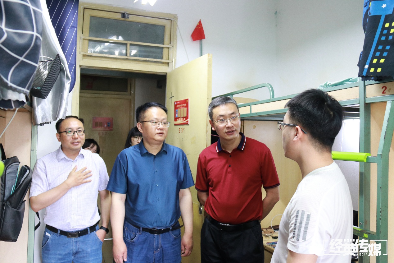 各位领导老师首先走访了研究生宿舍,各位毕业生的脸上洋溢着微笑,透露着即将毕业的喜悦。郭强仔细询问毕业生们未来工作去向或深造的学校,祝愿各位毕业生工作顺利,叮嘱大家临近毕业务必注意人身安全。书记、院长和同学们倾谈肺腑之言,言辞之中,充满关怀和亲切。