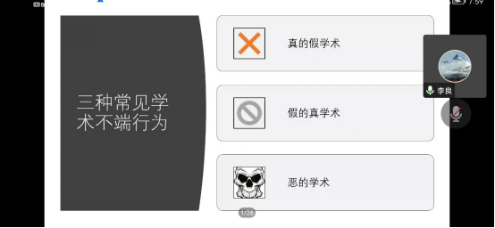 紧接着,李老师以“研究”为落脚点,从“什么是研究”、“如何做研究”、“研究伦理”三个方面为大家做了细致的讲解。其中又将学术不端行为分为“真的假学术”、“假的真学术”、“恶的学术”三类,总结了学术造假、剽窃、罔顾伦理等行为。以小保方晴子、翟天临等学术不端案例来警醒同学们,学术不端可瞒过一时,不能瞒过一世。