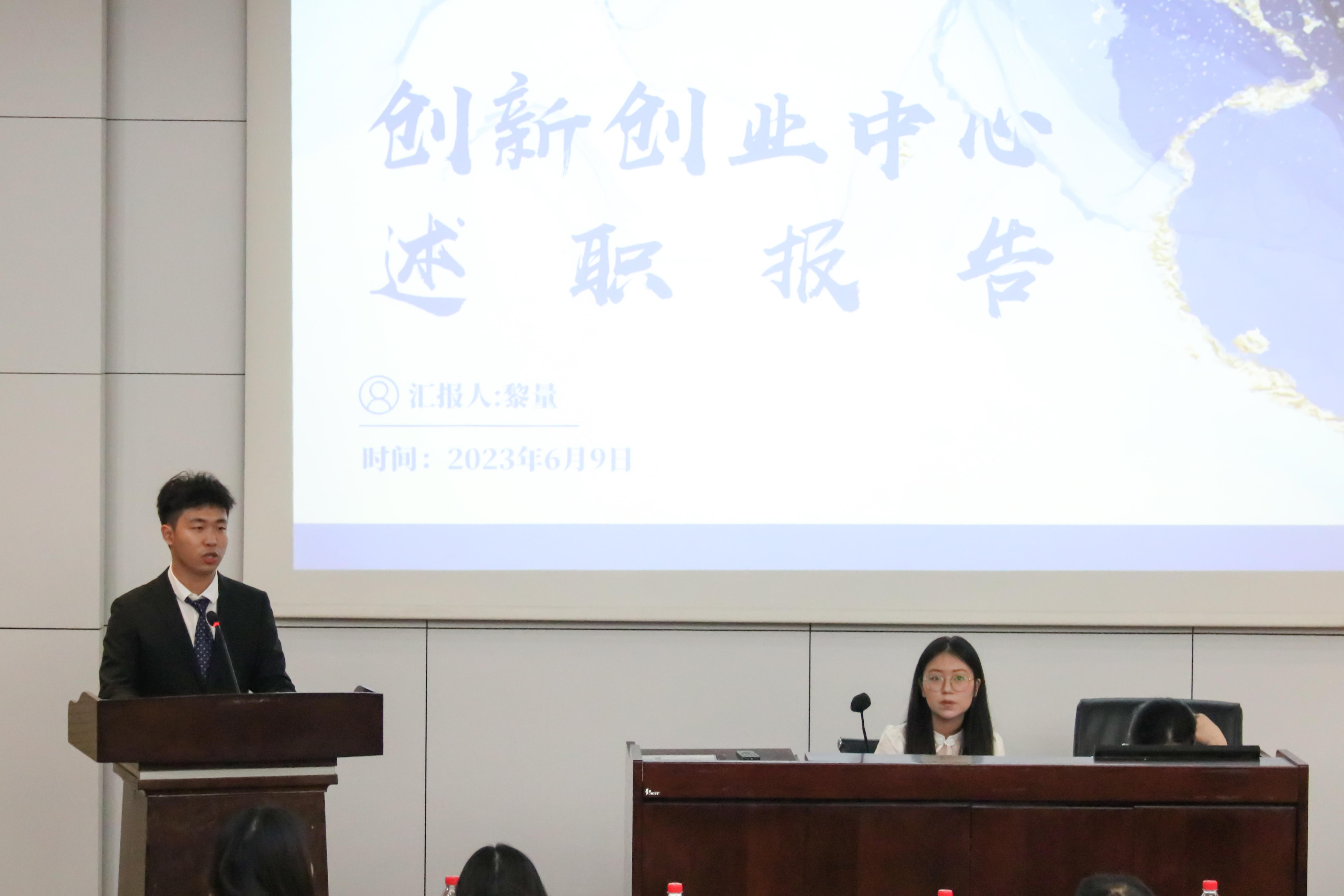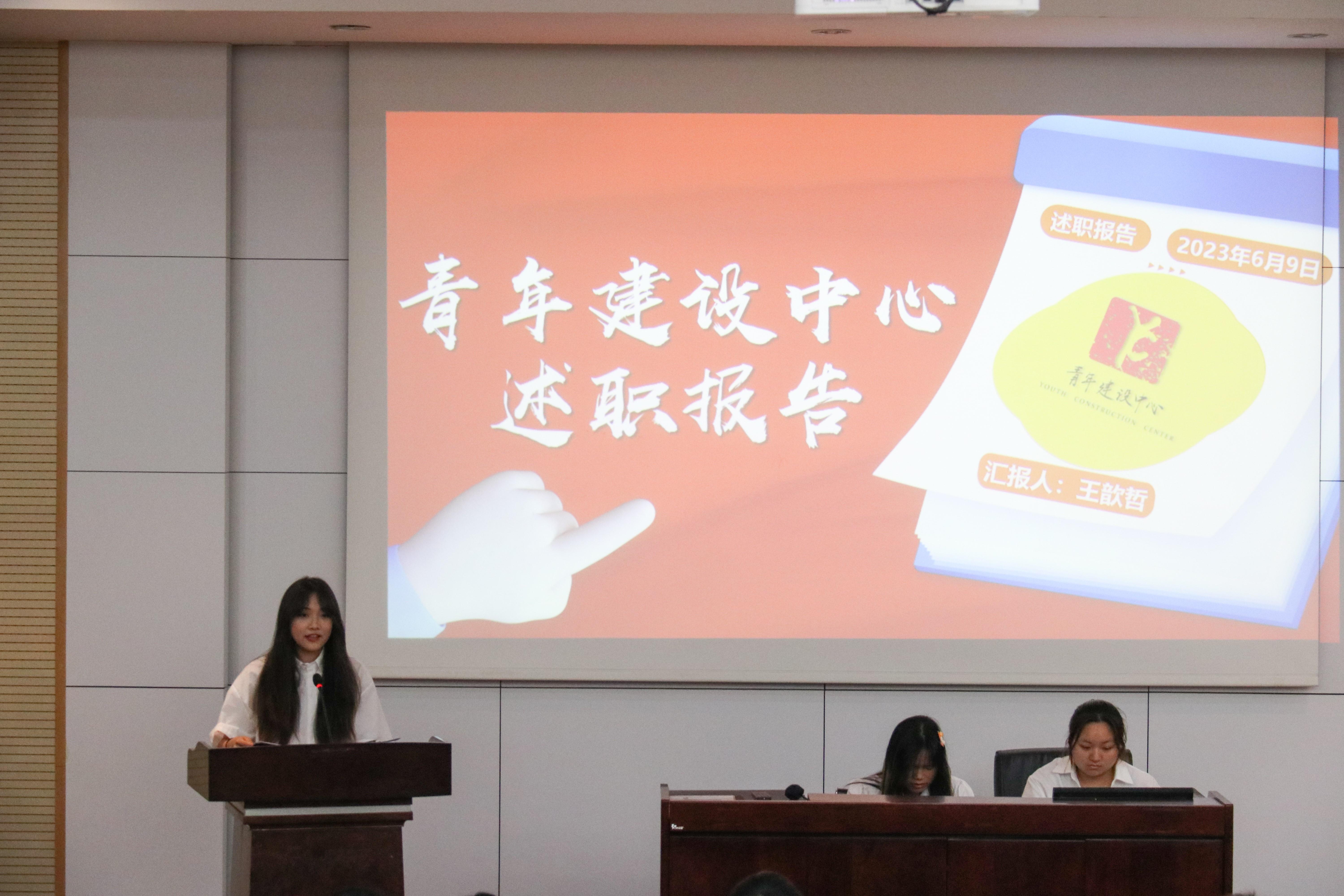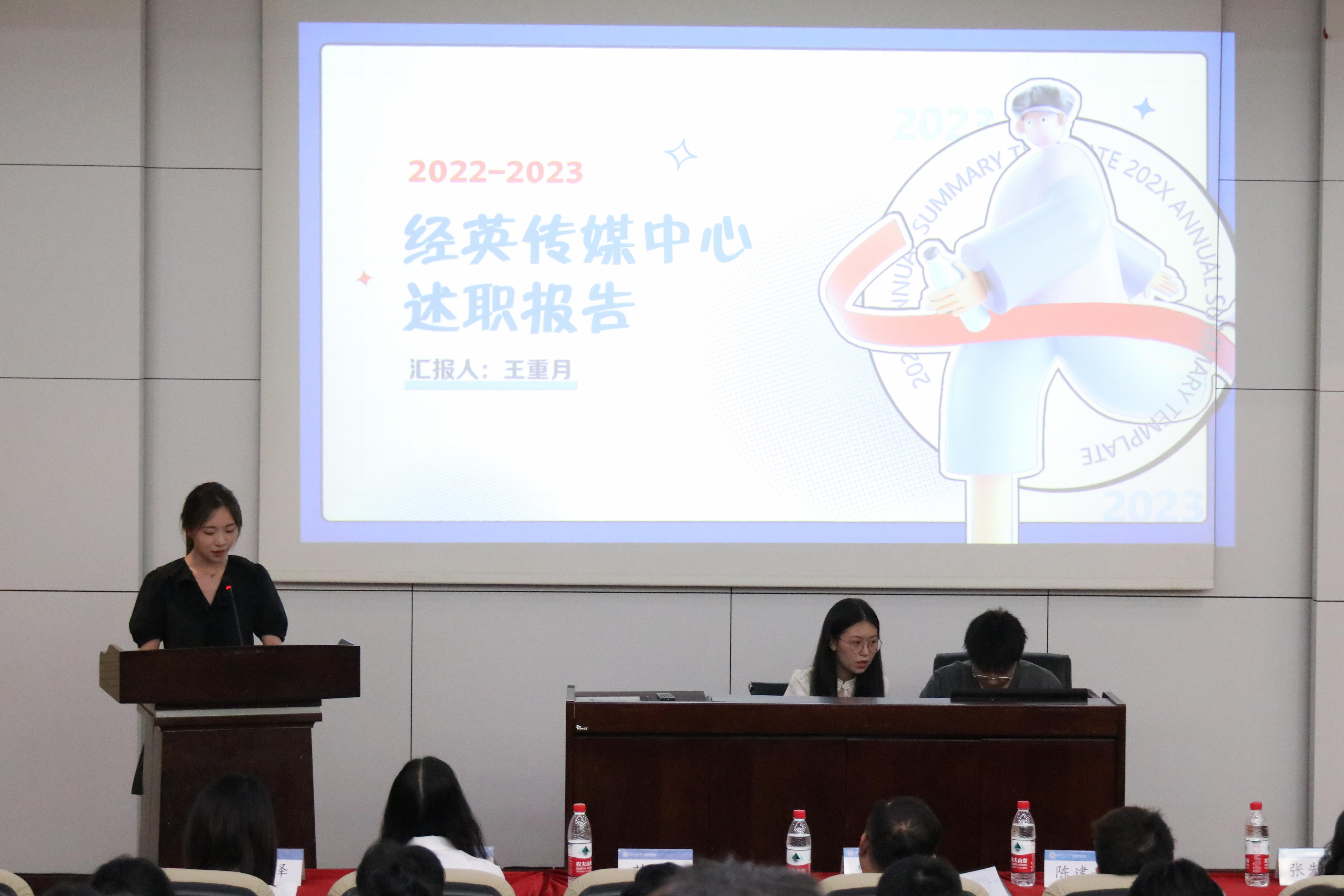 365官网的六个团学组织青年建设中心、学生会、青年志愿者协会、创新创业中心、经英传媒中心、班级联合会的负责人依次述职。他们不仅回顾总结了一学年的工作,也对全体团学组织成员的辛勤付出和积极工作表示由衷的感谢。
