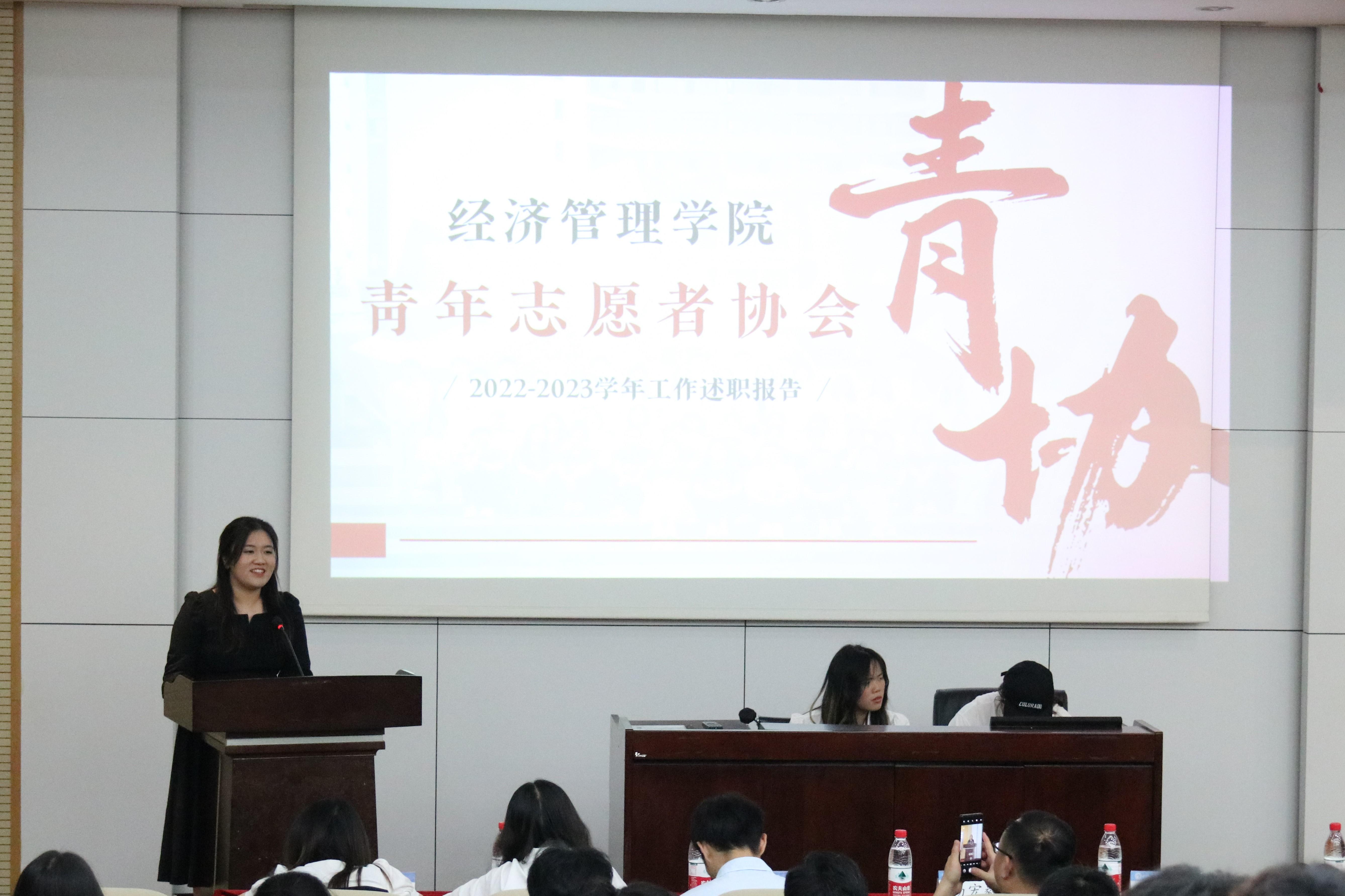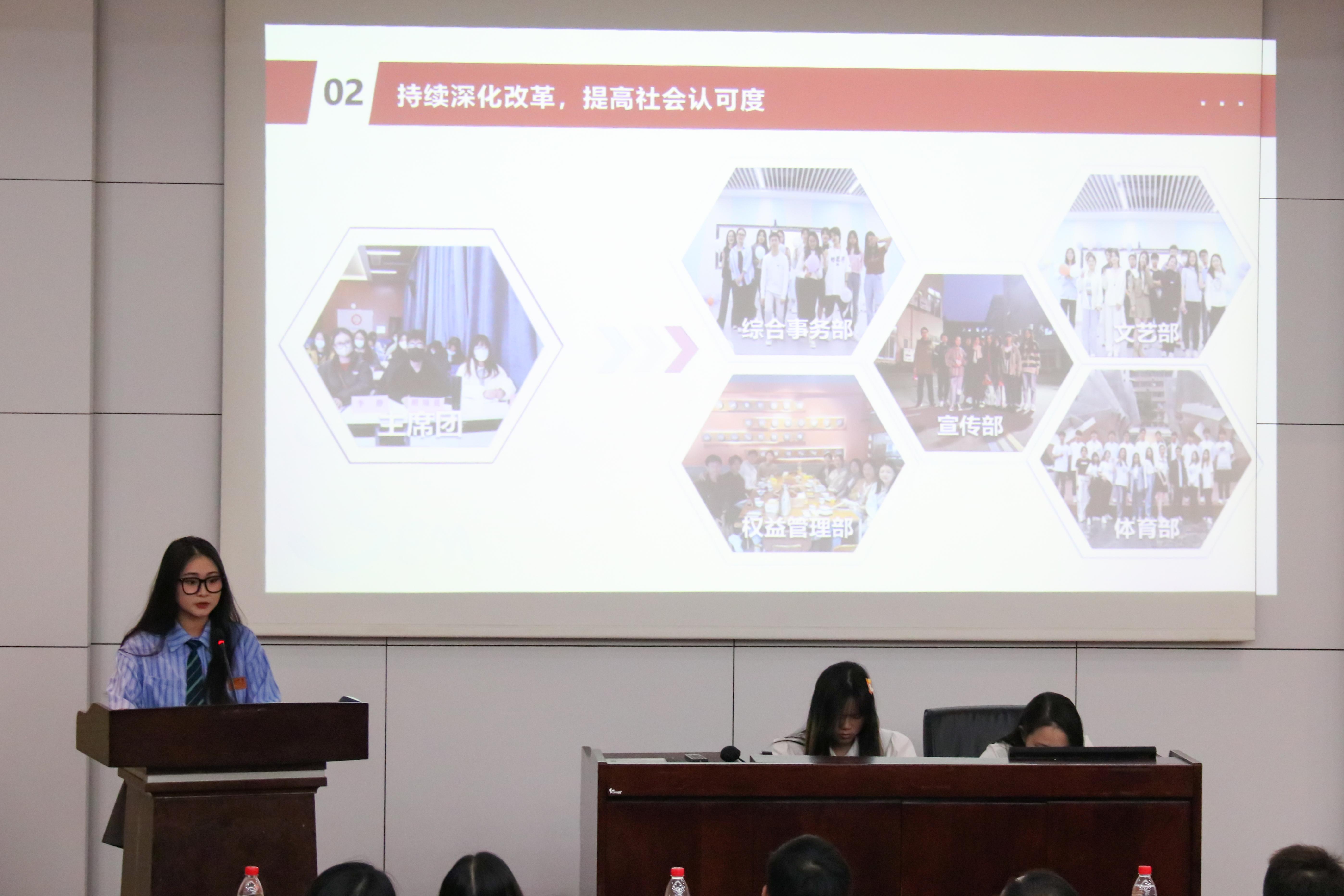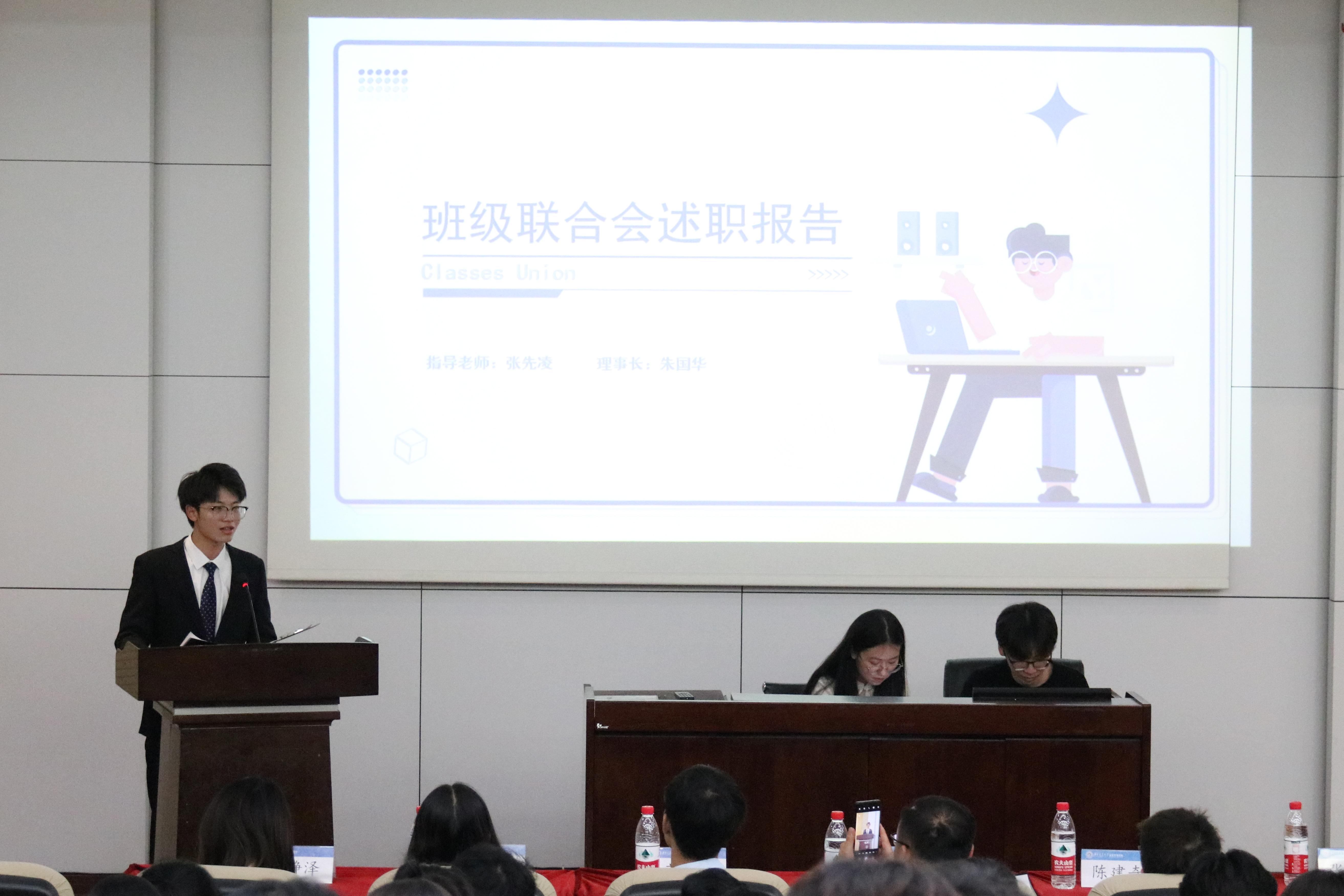 365官网的六个团学组织青年建设中心、学生会、青年志愿者协会、创新创业中心、经英传媒中心、班级联合会的负责人依次述职。他们不仅回顾总结了一学年的工作,也对全体团学组织成员的辛勤付出和积极工作表示由衷的感谢。