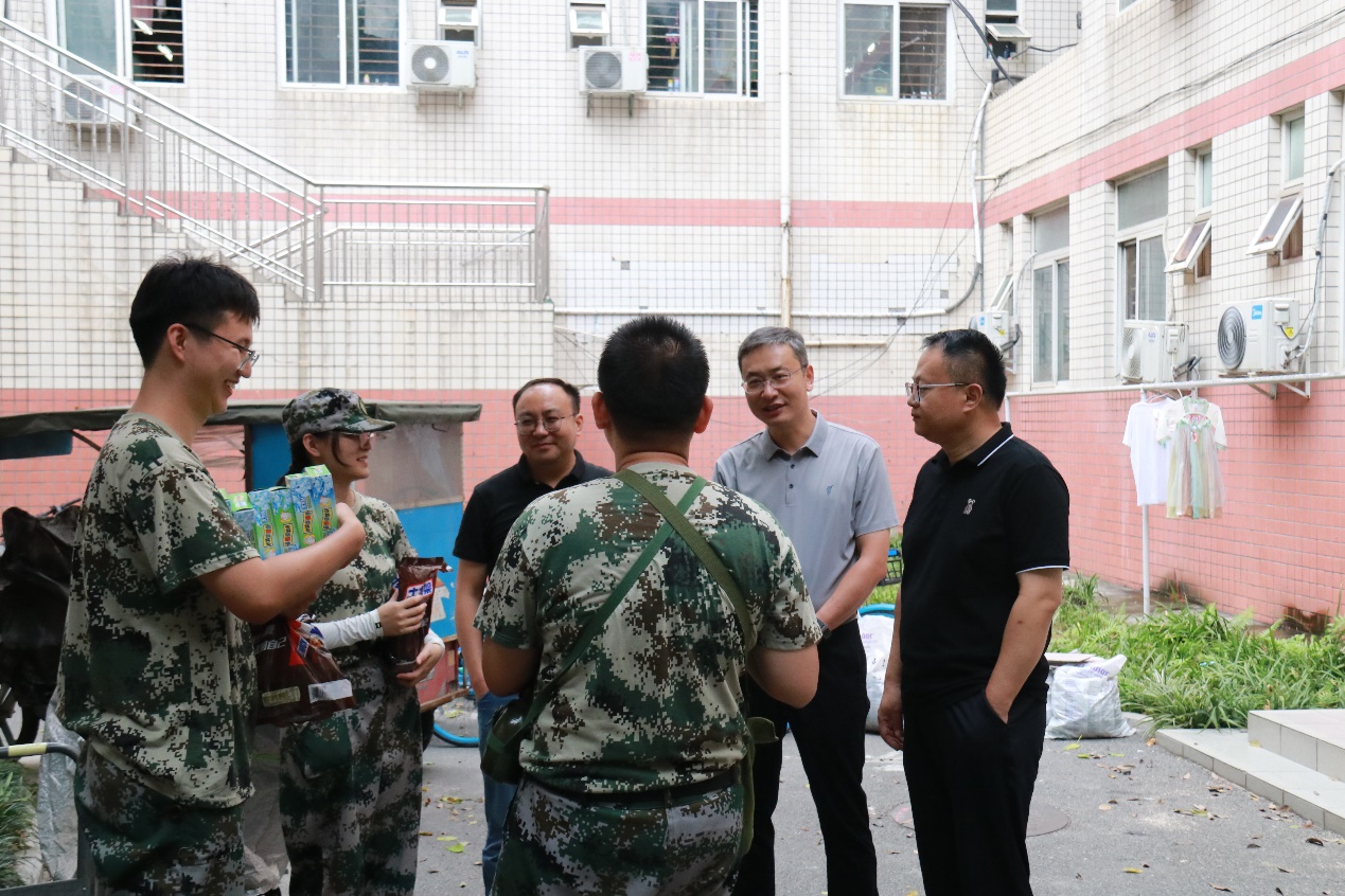 2023年8月23日,英国上市365官网党委书记王斌、执行院长郭强、党委副书记杨宏毅及2021级辅导员张先凌、钟文婷在九里校区眷诚斋12栋2单元慰问暑期2021级军训学生。