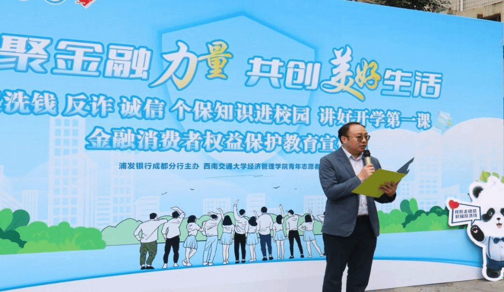 出席本次活动的嘉宾有经济管理学院党委副书记、学生工作组组长杨宏毅,学院团委副书记、青年志愿者协会指导老师陈建奇,浦发银行和中国人民银行成都分行的工作人员,此外,活动还特别邀请到成都市公安局金牛区反诈联席办警官。中午12点45分活动正式开始,主持人对到场的各位嘉宾做了简要介绍,并对参与活动的同学们表示热烈欢迎。随后,杨宏毅进行了致辞,他表达了对本次活动的认可与支持,希望通过此次活动让大家了解反洗钱、反诈拒赌、征信、个人信息保护、个人金融信息等金融知识,提升广大学生群体金融素养,提高反诈、识诈意识和能力。