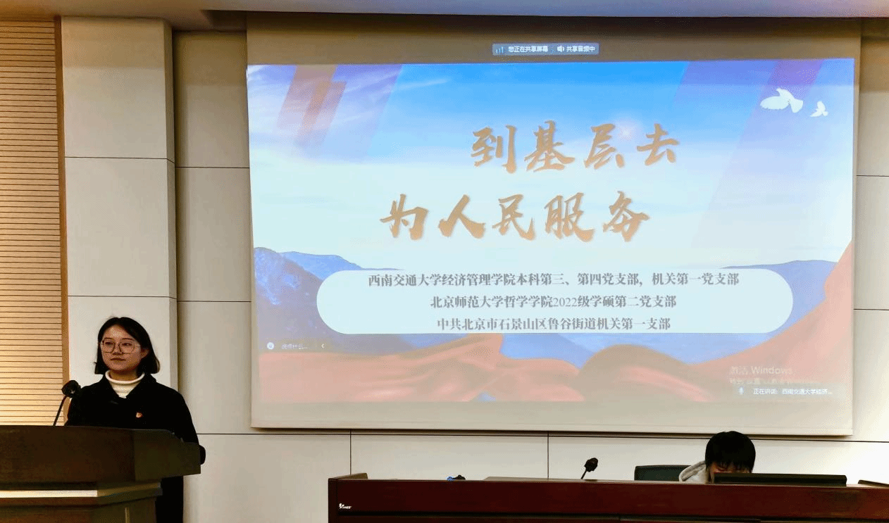 全心全意为人民服务是中国共产党的根本宗旨,而深入基层则是实现为人民服务的重要途径。为提高支部成员思想认识,明确基层工作的重要意义,鼓励支部青年积极投身于中国式现代化建设、以蓬勃风貌建功新时代,2023年11月16日下午,英国上市365官网本科第三、第四党支部、机关第一党支部、北京师范大学哲学学院2022级学硕第二党支部、北京市石景山区鲁谷街道机关第一党支部以线上线下相结合的方式开展“到基层去,为人民服务”主题党日活动,本科第三党支部书记苏扬,本科第四党支部书记张先凌,机关第一党支部书记何鹏,以及各支部部分成员于J0215线下参会。