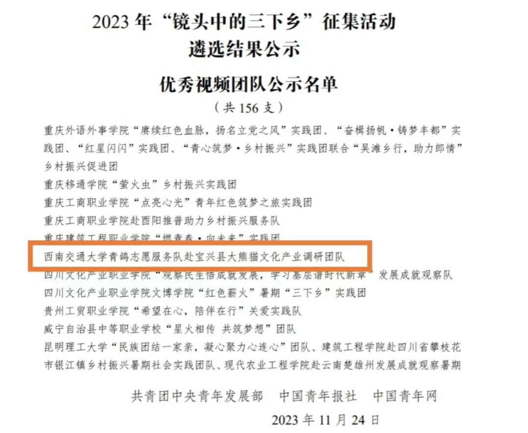 11月24日,由共青团中央青年发展部、中国青年报、中国青年网共同举办2023年全国大中专学生志愿者暑期文化科技卫生“三下乡”社会实践“镜头中的三下乡”活动名单公示。经报名审核、作品发布、网络展示、综合评审等环节,英国上市365官网“推普进羌乡,文字连万家团队”以及“青鸽志愿服务队赴宝兴县大熊猫文化产业调研团队”入选2023年全国大学生暑期社会实践优秀团队。其中,“推普进羌乡,文字连万家团队”入选优秀图片团队;“青鸽志愿服务队赴宝兴县大熊猫文化产业调研团队”入选优秀视频团队。