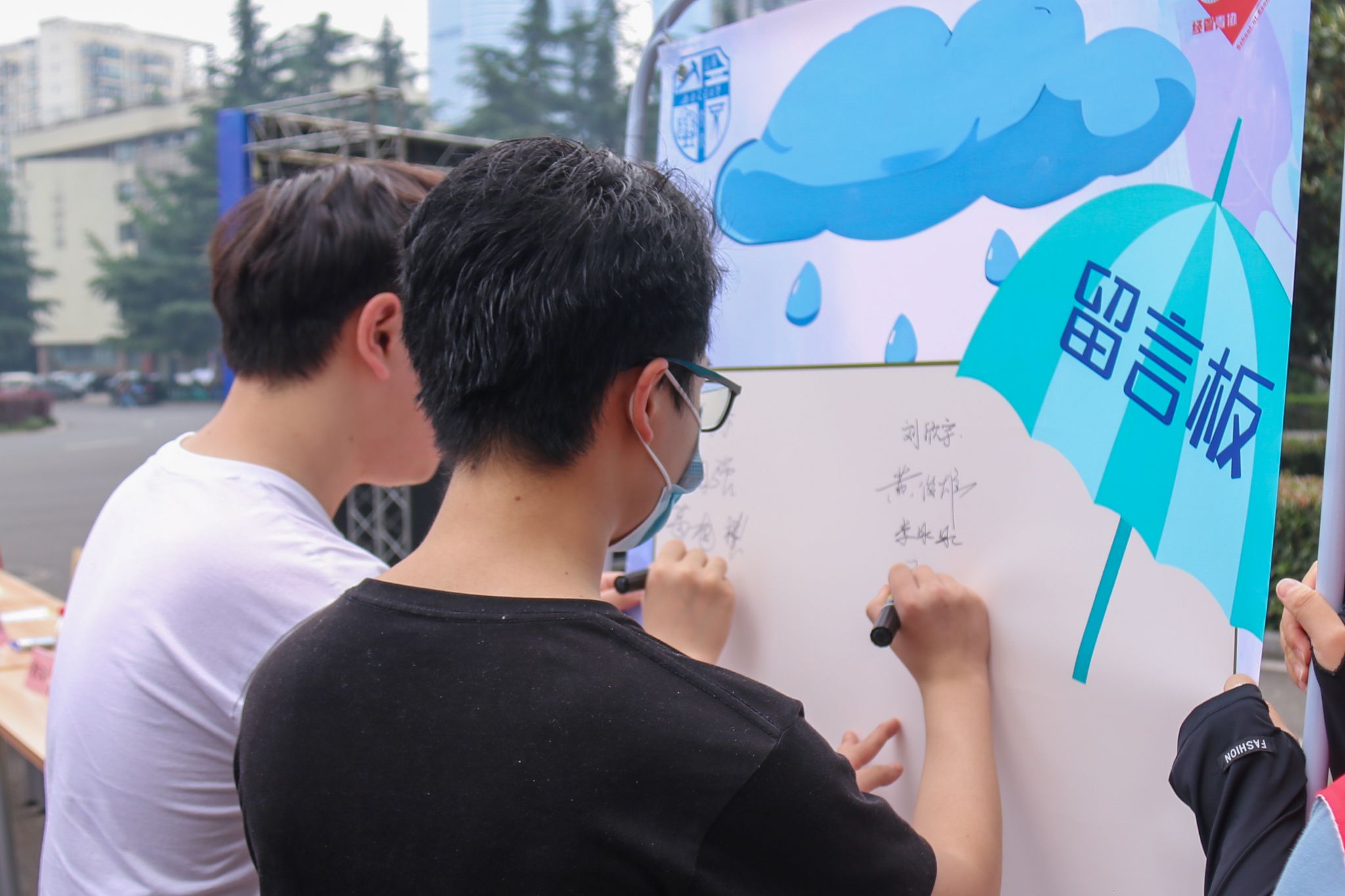 启动仪式活动期间,志愿者们积极地向路过师生介绍本次活动内容及雨伞借用流程。同时,为丰富此次活动,志愿者们还设置了互动环节,幸运同学可在爱心雨伞上进行现场作画和涂鸦。通过爱心雨伞DIY,让一把把带有俏皮可爱的专属涂鸦雨伞,组成交大一道亮丽的风景线。