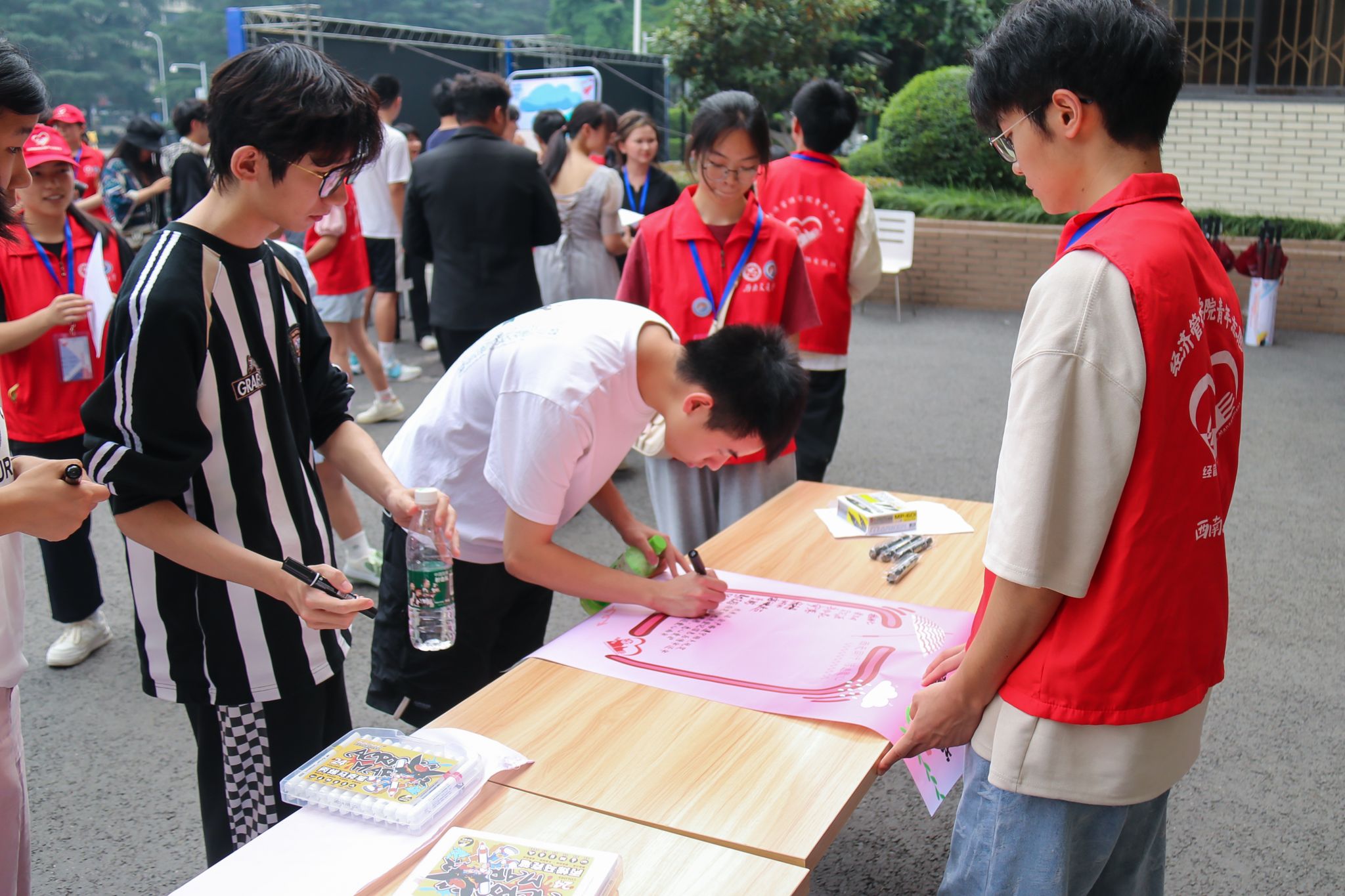 为增强同学们树立文明使用爱心雨伞意识,志愿者组织同学们签署文明使用承诺书,承诺遵守规定,合理使用,悉心爱护,定点及时归还。并准备留言板写下建议诉求、想法心声,从而帮助青年志愿者协会完善工作,使其更好地服务广大师生。活动结束后,志愿者们向各个投放点投放好爱心雨伞并粘贴借伞流程图和相应的二维码,以便后续借伞活动的完成。此外,爱心雨伞由志愿者们分组维护和定期管理,以便为交大师生提供更优质的服务。