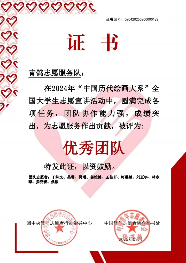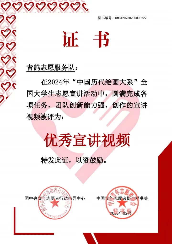 为深入学习贯彻习近平文化思想及党的二十大精神,积极响应“强国复兴有我”群众性主题宣传教育活动的相关要求,促进中华优秀传统文化的传承发展与国际交流,团中央青年志愿者行动指导中心、教育部中外语言交流合作中心、中国外文局文化传播中心、浙江大学与中国文物报联合开展了2024年“中国历代绘画大系”全国大学生志愿宣讲活动。近日,在宣讲服务团评选活动中,英国上市365官网青鸽志愿服务队以其优异的表现,荣获“优秀团队”;同时,团队精心创作的活动视频被评选为“优秀宣讲视频”。