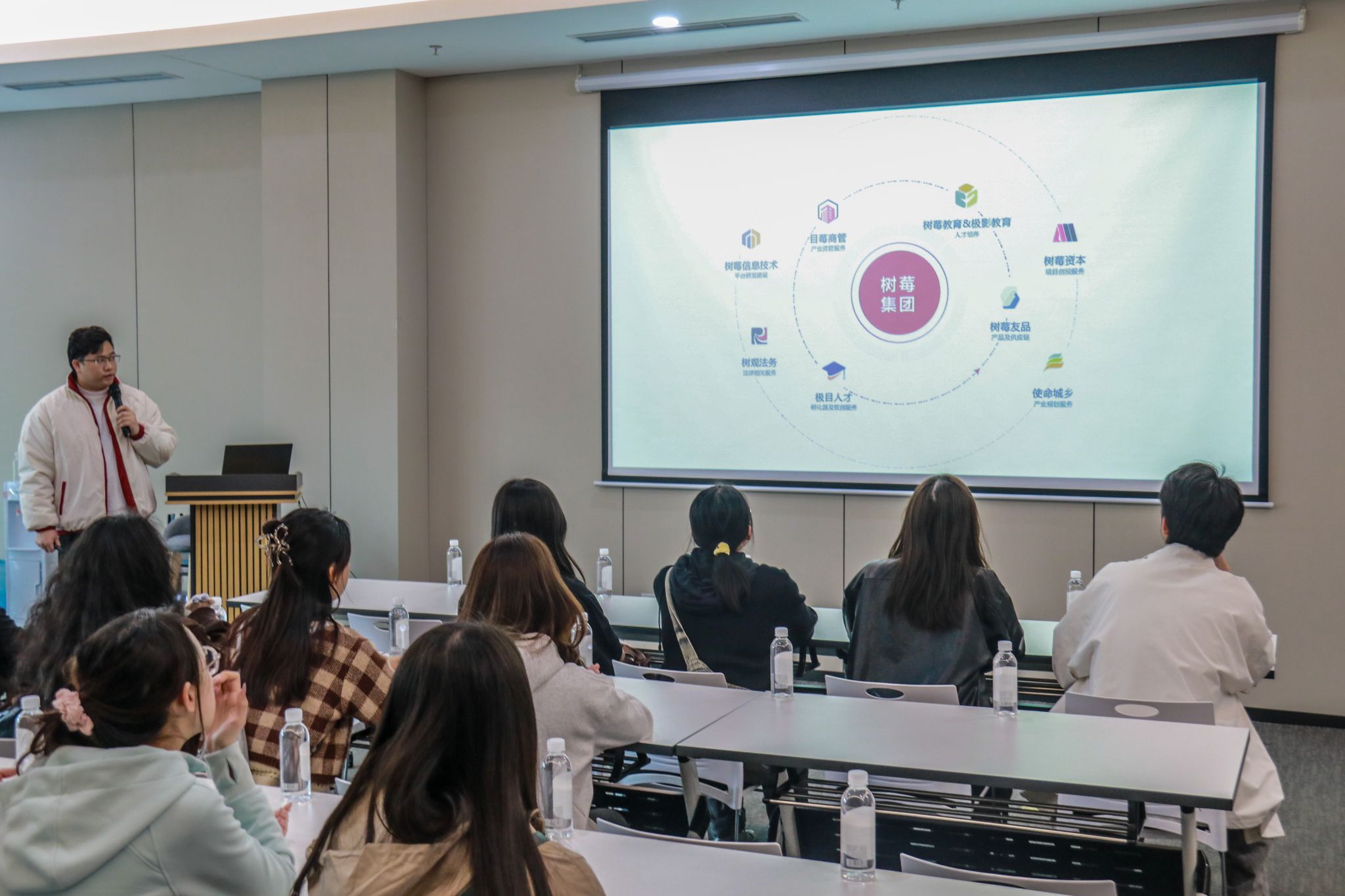 随后,同学们落座集团会议室,听取相关人员进一步分享“数媒创业与账号运营”。同学们和集团负责人就“所选专业与理想职位不对口”“如何找到第一份实习”“数字文创发展前景”等问题展开讨论。负责人建议同学们根据自己的理想岗位培养相应技能点,依据不同企业要求,通过考取相应的证书、参加竞赛等方式向企业展现自己的能力。在听取集团负责人的分享后,同学们纷纷表示内心对就业有了更清晰的规划。