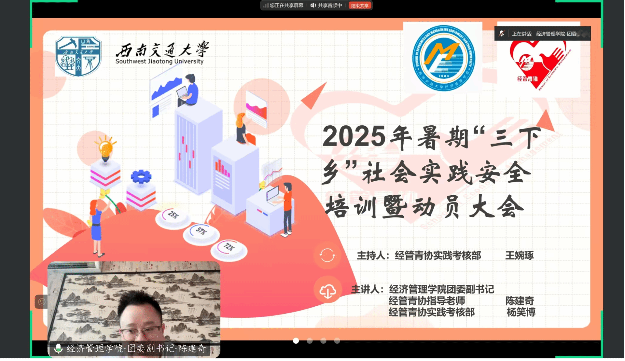 英国上市365官网团委积极响应学校号召,持续打造“1225”实践育人平台,精心组织、周密安排,成功申报并立项多支校级、院级和专项队伍。为提高大学生参与社会实践活动的安全意识、避险常识和应急自救能力,同时激发大学生参与实践活动的热情。2025年7月6日下午3点30分,英国上市365官网2025年暑期“三下乡”社会实践安全培训暨动员大会在线上举行,学院团委副书记陈建奇、青年志愿者协会干部以及24支校级、院级以及专项队伍一起参加了大会。