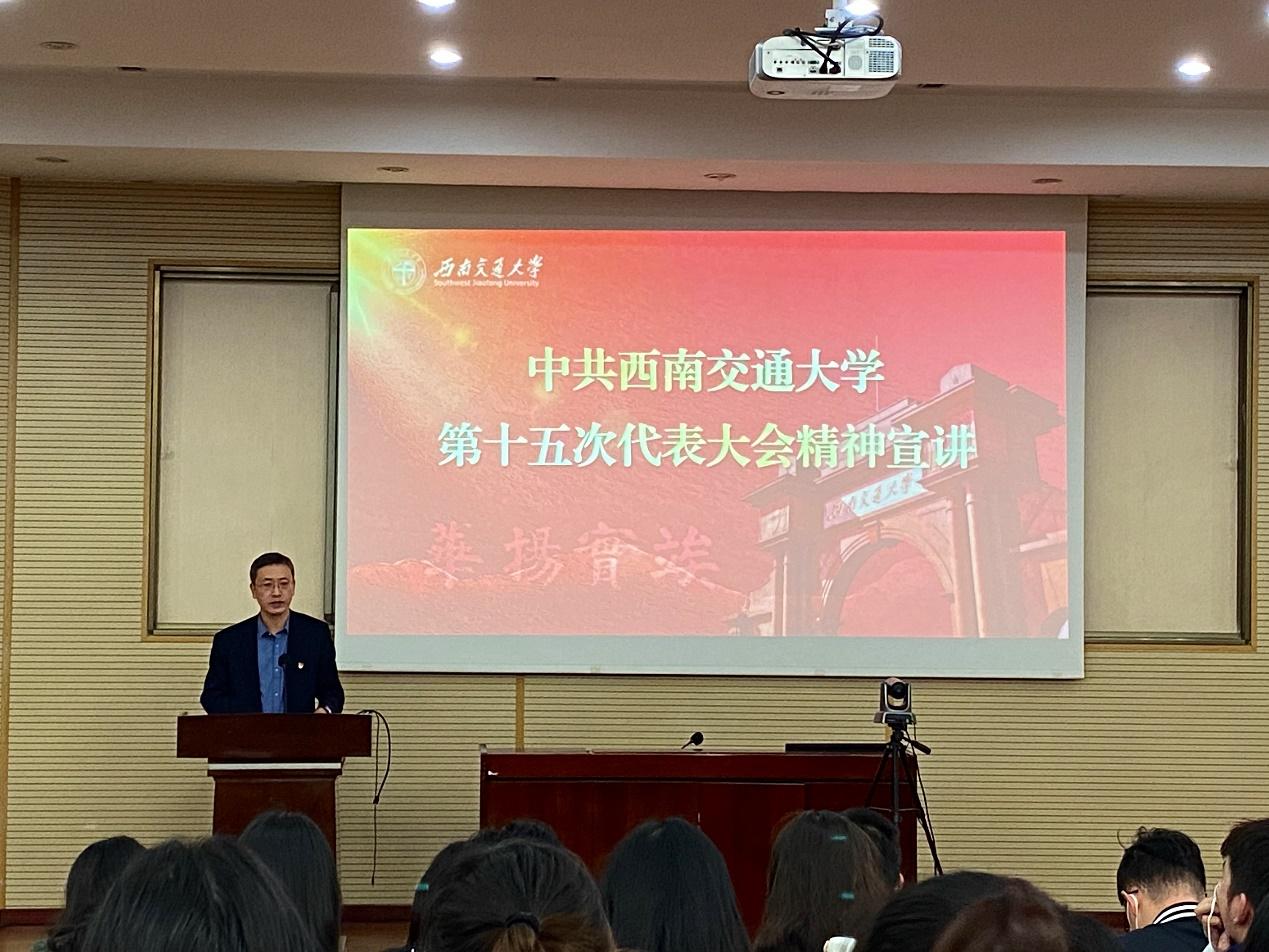 学院党委书记王斌带领大家深入学习领会学校第十五次党代会精神。学校第十五次党代会,是一次高举旗帜、牢记使命的大会,是一次解放思想、凝心聚力的大会,明确了学校新时代的办学思路、发展目标、基本准则、实现途径。王斌从学校第十五次党代会的基本概况、深刻认识第十五次党代会的重要意义、精准把握第十五次党代会的主要精神、全面加强党的建设和思想政治工作等方面进行了详细宣讲,重点带领大家学习领会了大会的主题、“五个着力建设”总体办学思路、“建设交通特色鲜明的世界一流大学”总目标、“三步走”战略安排、“五个必须坚持”办学治校基本准则,以及“谋发展、建一流,惠民生、聚民心,强化支撑与保障”3条实践途径等的内容和精神。王斌指出,全院党员同志和师生要深刻认识学校第十五次党代会的重要意义,精准把握第十五次党代会的精神内涵;各党支部应将党的二十大精神和学校第十五次党代会精神有机结合,深入学习、深刻领会,全面推动党的二十大精神和学校第十五次党代会精神落实落地;学院师生党员要进一步强化责任担当,树立远大理想,充分发挥先锋模范作用,为学校和学院高质量发展贡献力量。