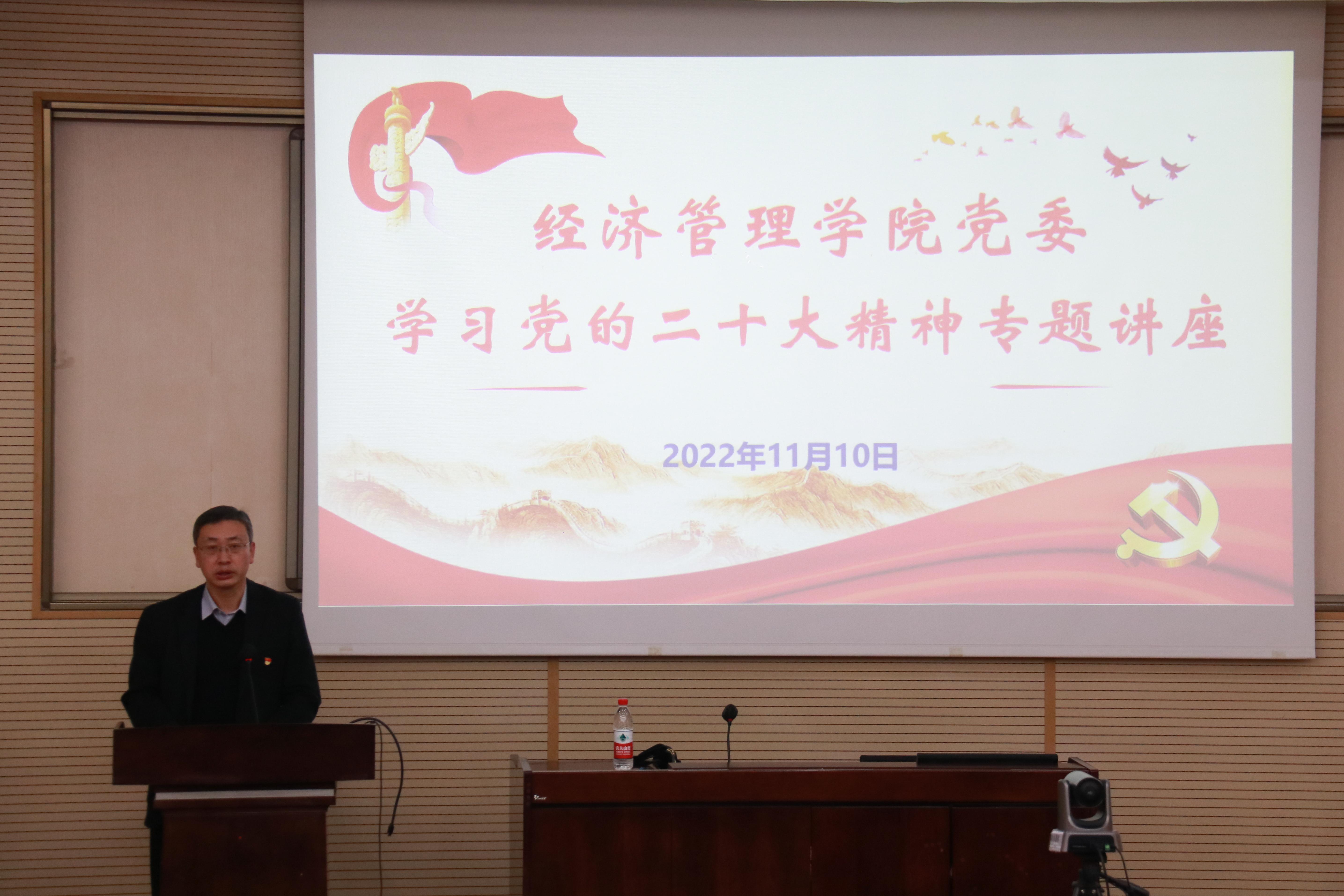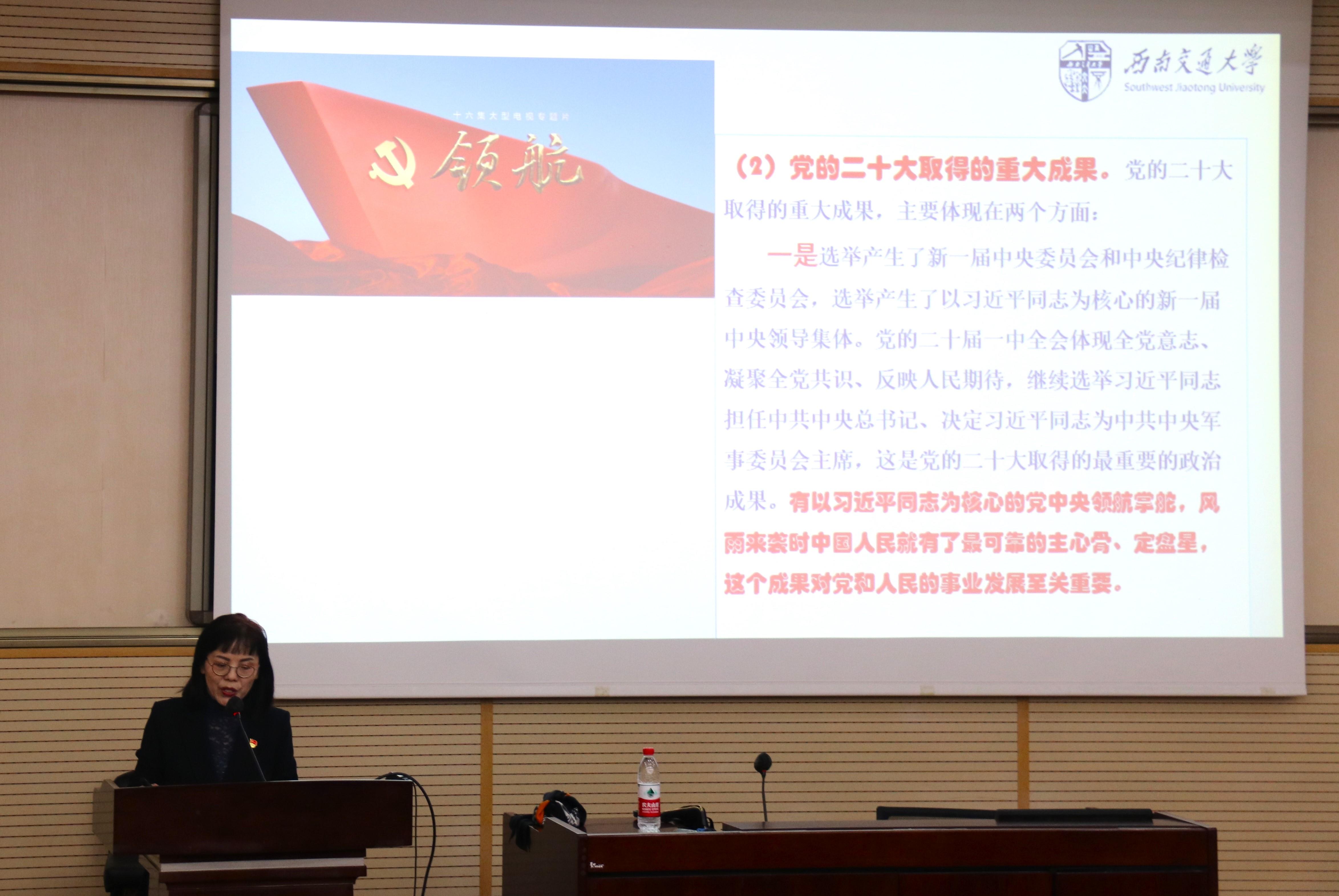 为深入学习贯彻党的二十大精神,英国上市365官网党委特邀四川省委宣讲团专家库成员、英国上市365官网马克思主义学院教授何薇老师于11月10日下午在九里校区0202教室作题为《学报告悟思想开新局——深入学习领会党的二十大精神 坚定不移推进全面从严治党》的专题报告。讲座由学院党委书记王斌主持,学院党委委员、院领导、各师生党支部委员参加了此次专题讲座。