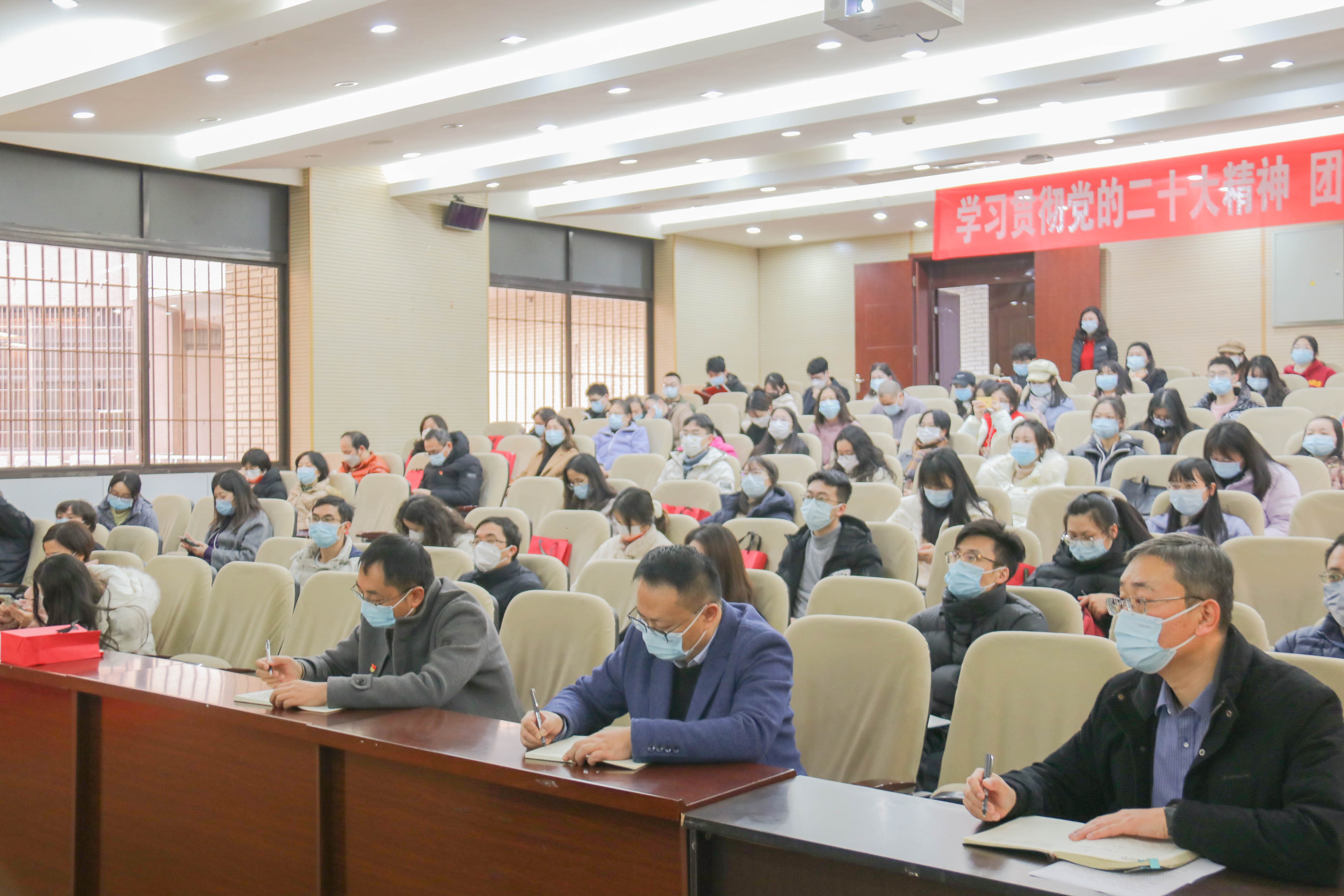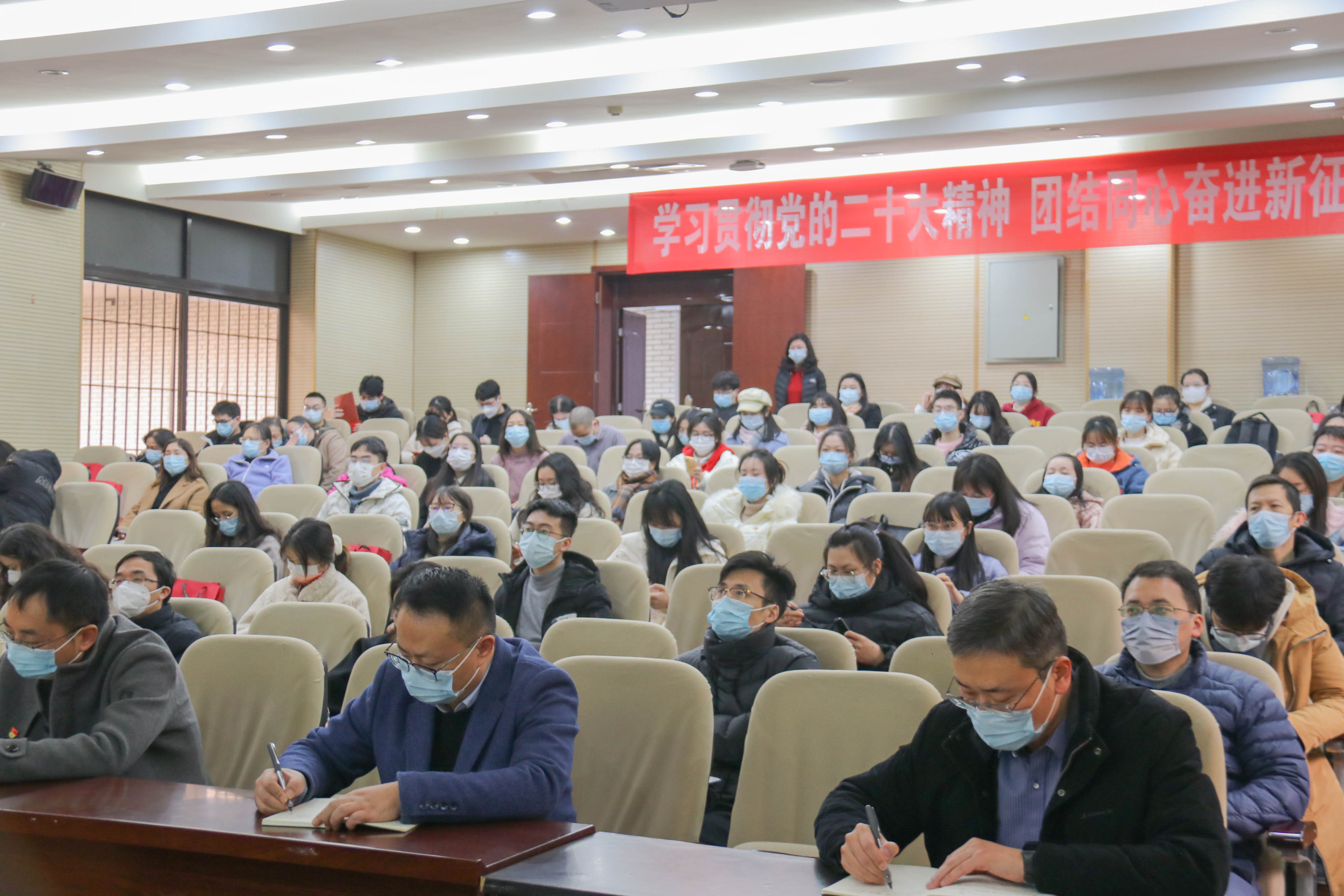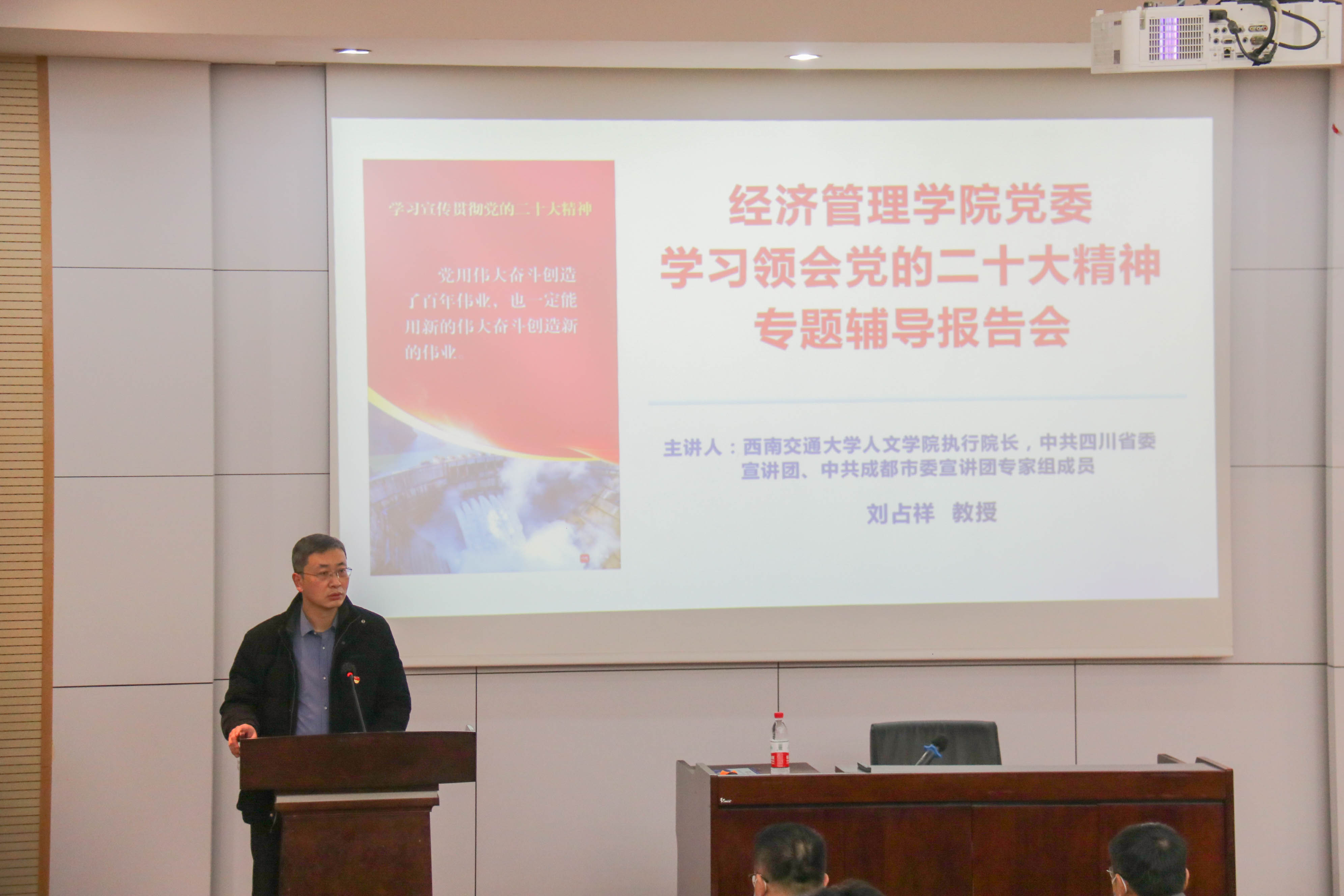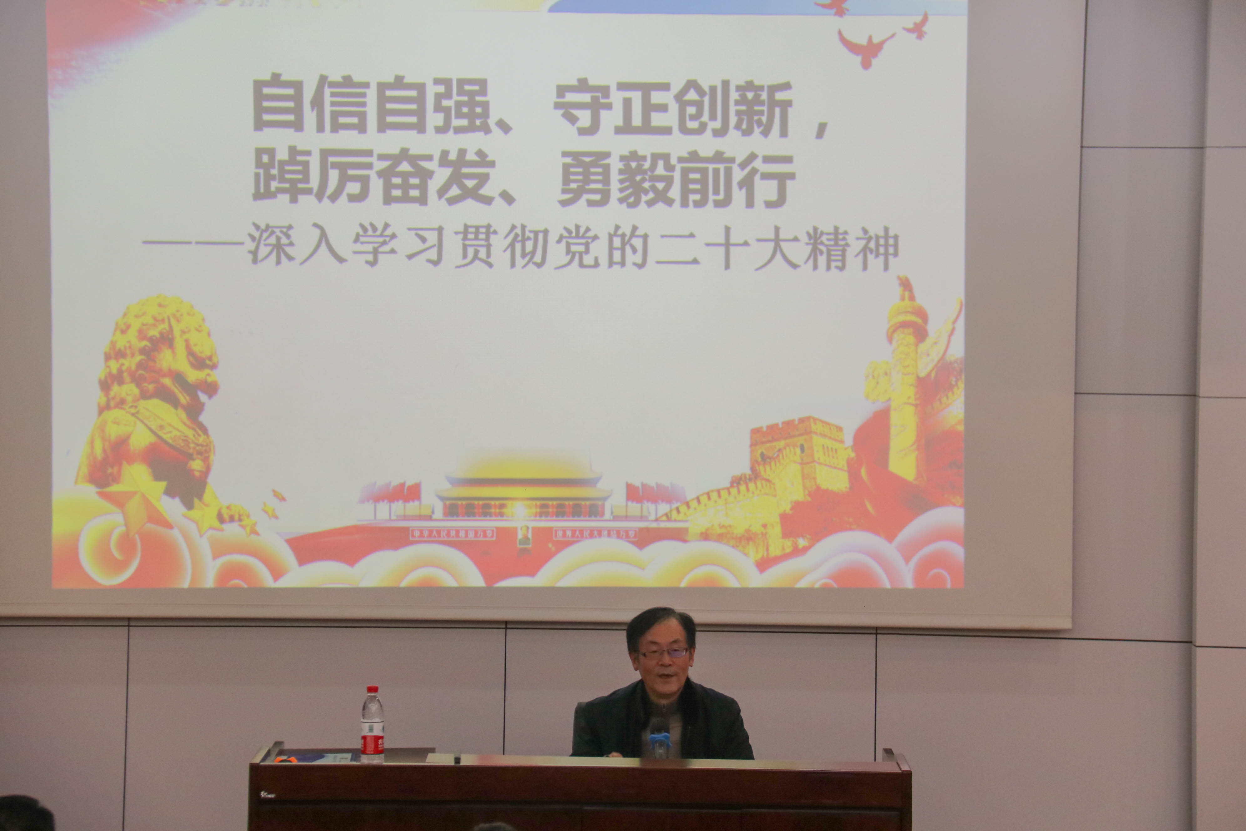 12月8日下午,英国上市365官网党委邀请英国上市365官网人文学院执行院长,中共四川省委宣讲团、中共成都市委宣讲团、英国上市365官网宣讲团专家组成员刘占祥教授作了题为“自信自强、守正创新、踔厉奋发、勇毅前行——深入学习贯彻党的二十大精神”的专题辅导报告,学院党政领导班子、师生各党支部委员、党外知识分子、机关工作人员共100余人参加了报告会。报告会由学院党委书记王斌主持。