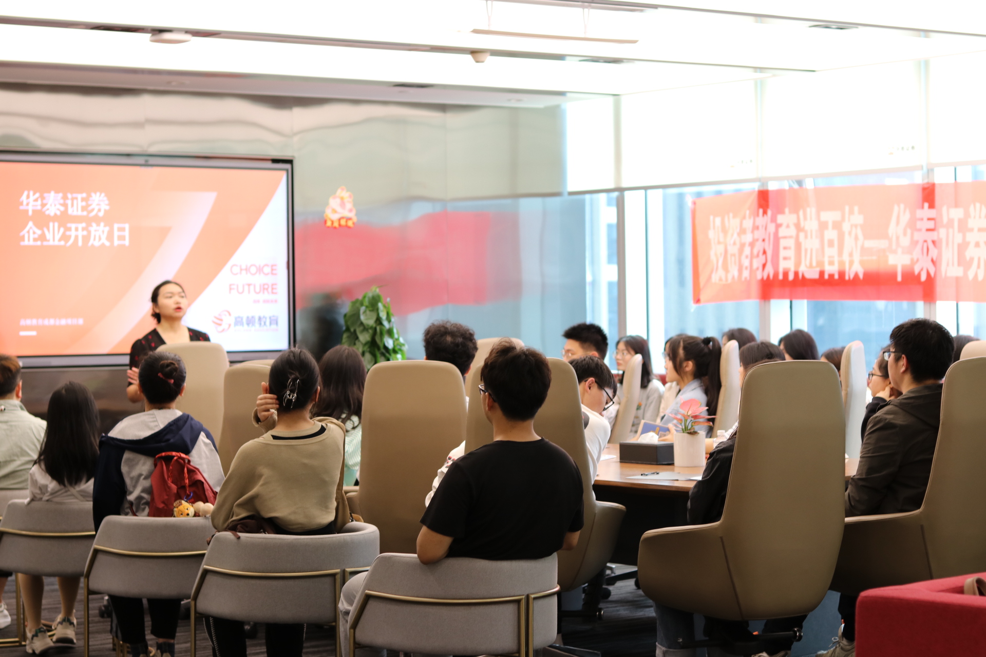 在华泰证券嘉宾分享环节,华泰证券的刘筑老师首先带领大家参观了华泰证券投教基地和办公区域。在参观完工作场所之后,她向大家介绍了华泰证券的发展历程、主营业务范围、校招岗位要求等内容。华泰证券1991年5月开业,紧随中国上交所、深交所的成立。在长足的发展中,实现了快速成长,成为第一家在上海、香港和伦敦三地上市的中国金融机构。公司注重科技驱动,营业部及分公司数量精简,业务覆盖广泛。2020年7月,2020年《财富》中国500强发布,华泰证券股份有限公司排名第366位。2020年获得“十大证券公司金牛奖”。通过刘筑老师的讲解,大家对券商架构、岗位内容、用人标准有了更加清晰、具体的认识。在分享中,刘老师提到,在校时一定要提前规划,注重实践、积累实习经验,要大胆自信,将上一次的积累应用到下一次的机会中。