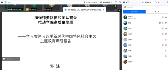 按照学校和学院学习贯彻习近平新时代中国特色社会主义思想主题教育工作部署,英国上市365官网工程管理系党支部于2023年7月30日在线开展了主题教育专题党课活动。学院党委委员、执行院长郭强同志讲授有关“加强师资队伍和团队建设 推动学院高质量发展”的专题党课。工程管理系党支部全体党员及部分非党员教师一起参加了学习。