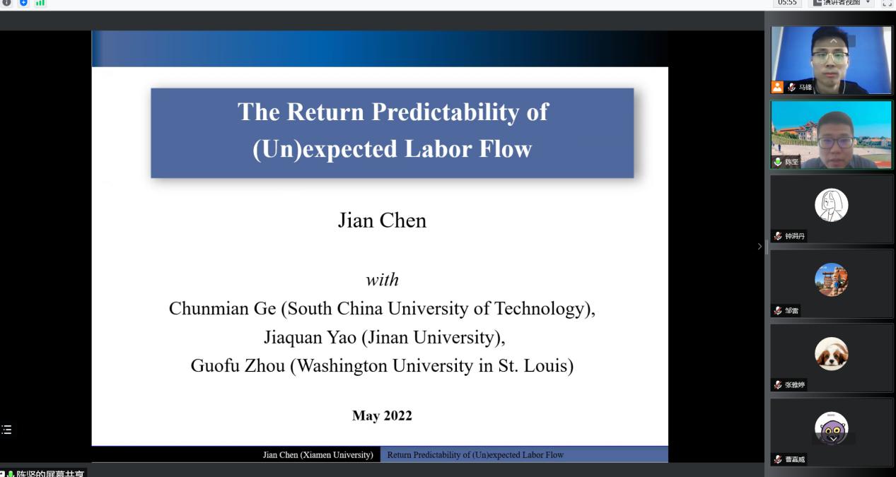 2022年5月17日上午10点,厦门大学经济学院陈坚教授的学术讲座在线上举行。陈坚教授以“The Return Predictability of (Un)expected Labor Flow”为主题进行了精彩的分享。本次学术活动由英国上市365官网马锋副教授主持,学院部分博士生和研究生在线参加了本次讲座。