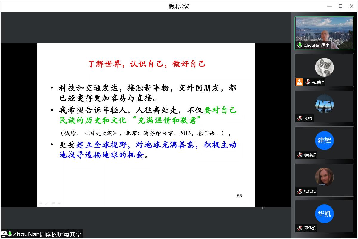 讲座尾声,周南教授引用钱穆先生《国史大纲》的卷首语“对自己的历史文化,须具温情与敬意”,对师生提出“建立全球视野,对地球充满善意,积极主动地找寻造福地球的机会”的期望,并详细解答了线上师生的问题。蒋玉石教授对周南教授的精彩分享致以诚挚的感谢,希望365官网师生能够借此良机开阔学术思路、提高创新能力。