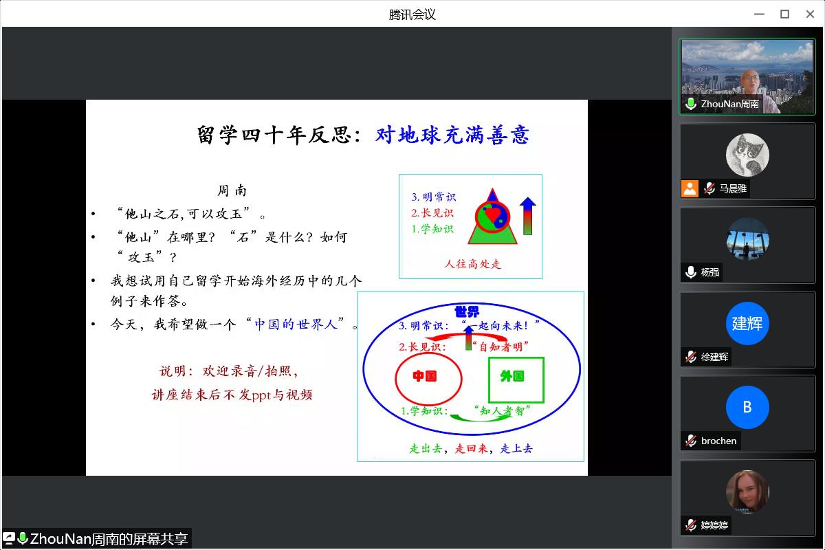 随后,周南教授从“学识是人成长的基石”、“见识是基石上的夯土”、“常识是夯土上的楼台”三个层面讲述了从1982年开启的“他山”求学生活,以及“行万里路”所带来的认知、思维、行为模式与人生路、学术路的转变,希望自己在“学知识、长见识、明常识”的道路中已经从“身份上的中国人”成长为“精神上的中国人”,并继续成长为一个立足于中国、与人为善、超越民族主义思维、具有世界情怀的“中国的世界人”。
