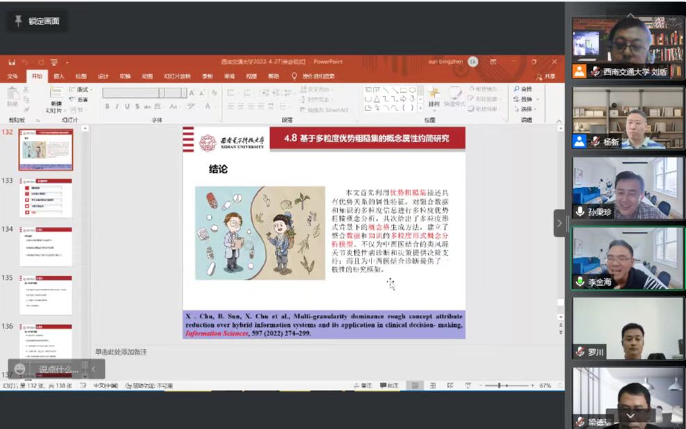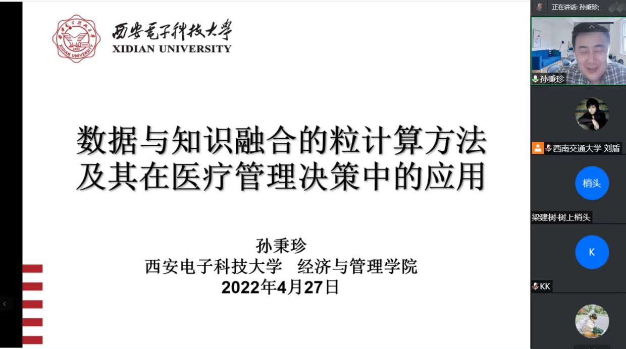 2022年4月27日下午2点,西安电子科技大学孙秉珍教授和昆明理工大学李金海教授应邀在腾讯会议上分别开展了题为“数据与知识融合的粒计算方法及其在医疗管理决策中的应用”、“网络概念知识发现”的线上学术报告。英国上市365官网信息系统与运营管理系刘盾教授主持了此次讲座,校内外师生100余人参加了此次学术交流。