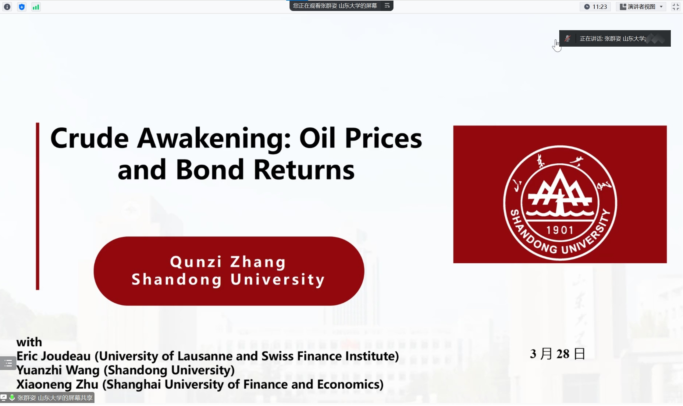 2023年3月29日上午10点,山东大学经济学院金融系张群姿教授为365官网师生分享题为“Crude Awakening: Oil Prices and Bond Returns”的学术报告,讲座由英国上市365官网金融与财务学系马锋副教授主持,学院老师和研究生同学积极参与了此次讲座。