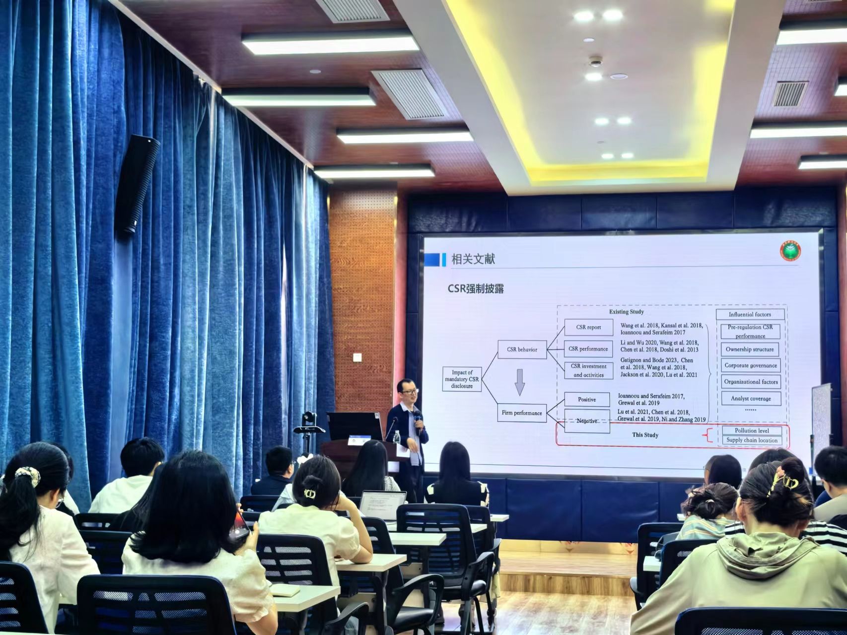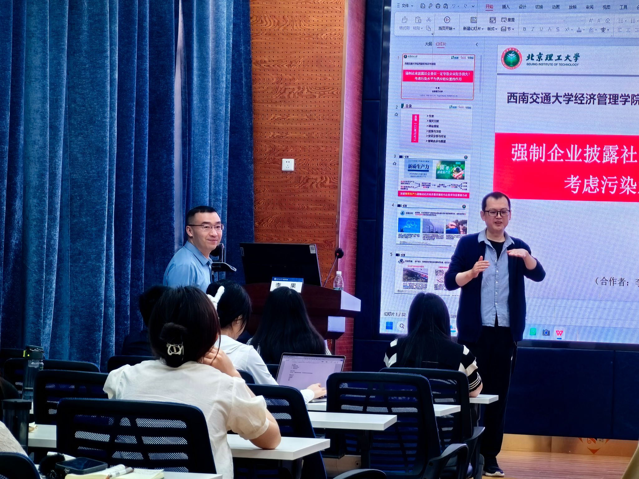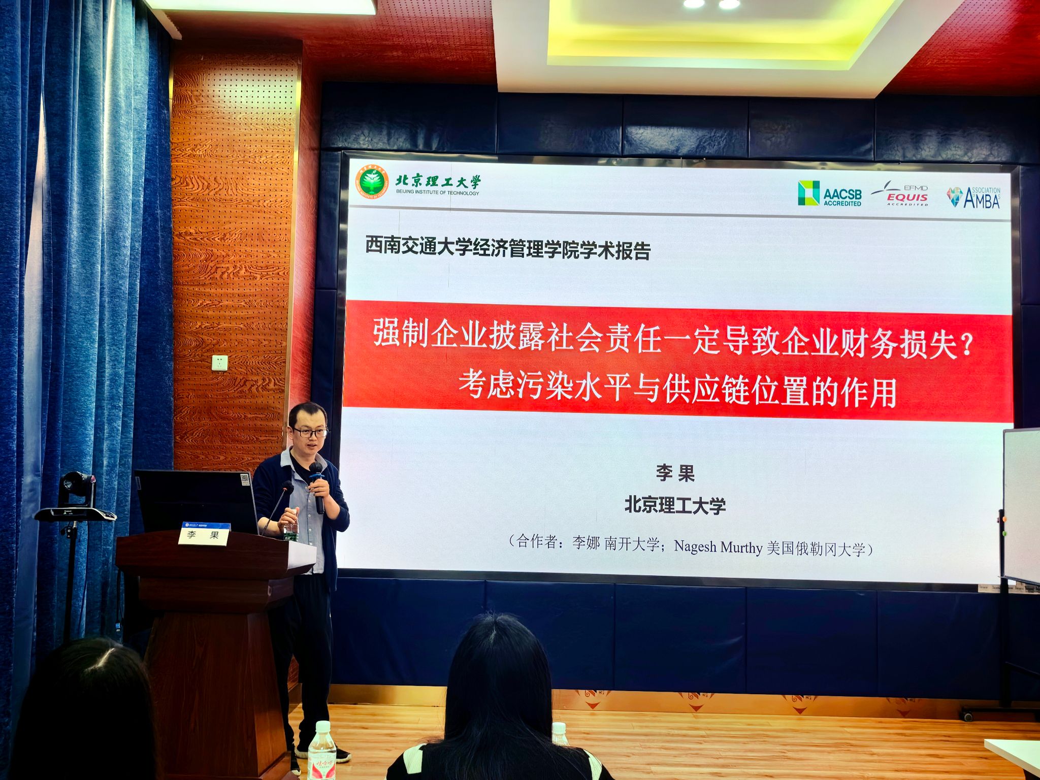 2024年5月24日,北京理工大学管理与经济学院管理科学与物流系主任,国家高层次人才计划入选者李果教授应学院邀请,来365官网展开学术交流活动,交流主题为“强制企业披露社会责任一定导致企业财务损失?考虑污染水平与供应链位置的作用”。本次学术活动由学院副院长聂佳佳教授主持,学院部分教师、博士生和硕士生等50多人参加了此次学术活动。聂佳佳教授首先对李果教授的学术成果进行了介绍,同时对李果教授的来访表示热烈的欢迎!