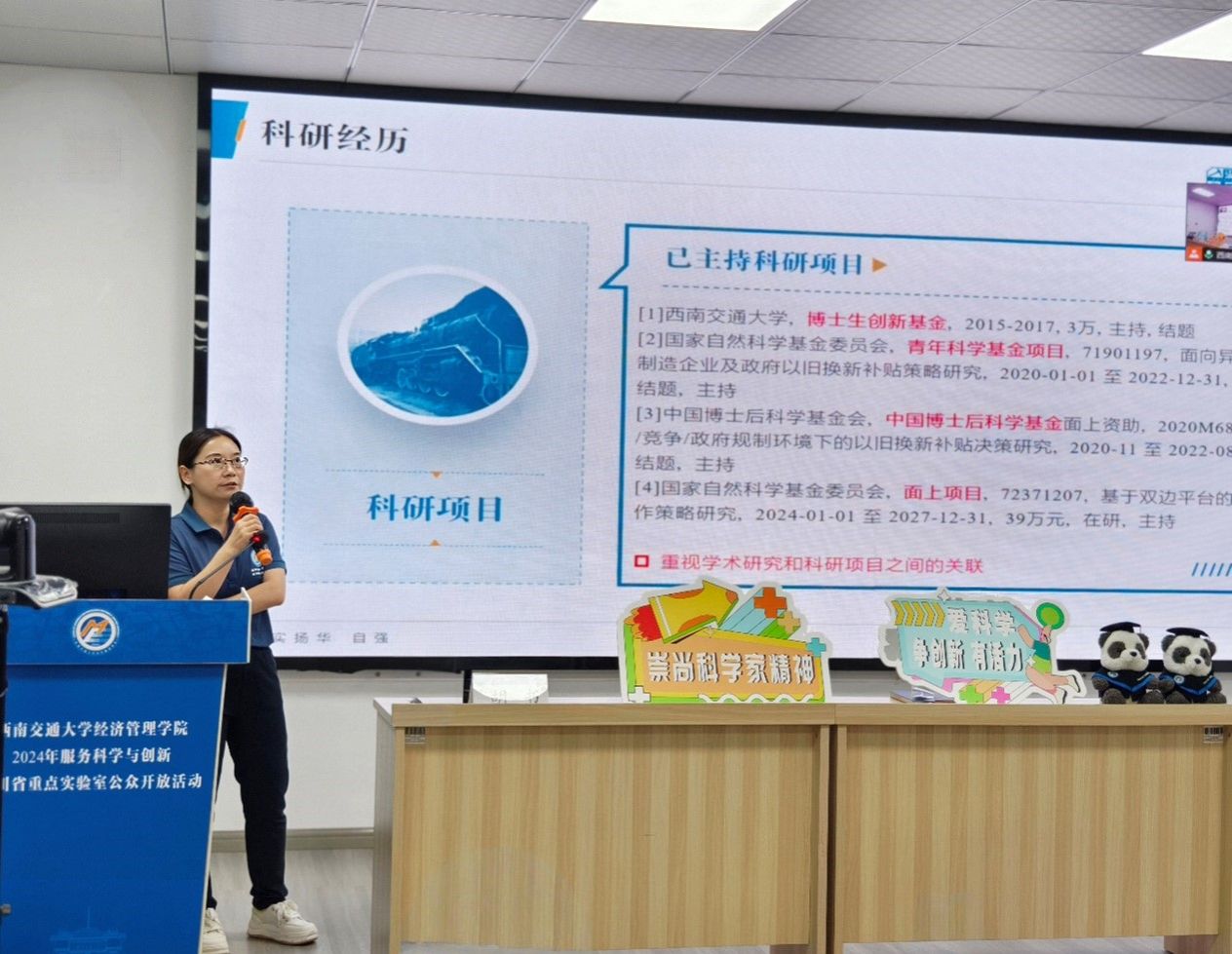 接着,胡书助理教授的学术讲座题目为“ 浅谈如何开展模型研究——以在线平台的产品信息和市场信息公布策略为例”。胡书老师以在线平台为背景,介绍了在线平台对产品信息和市场信息的最优公布策略,并通过开展多个拓展模型来探讨该最优策略的适用性。胡书老师还结合自身项目申报及UTD24期刊论文发表的科研经历,深入浅出地从确定选题、模型构建及求解、结果分析与数值仿真、论文写作四个方面讲解了如何开展模型研究。胡书老师谦虚地陈述着自己的研究经历,同学们发出了阵阵赞叹声。
