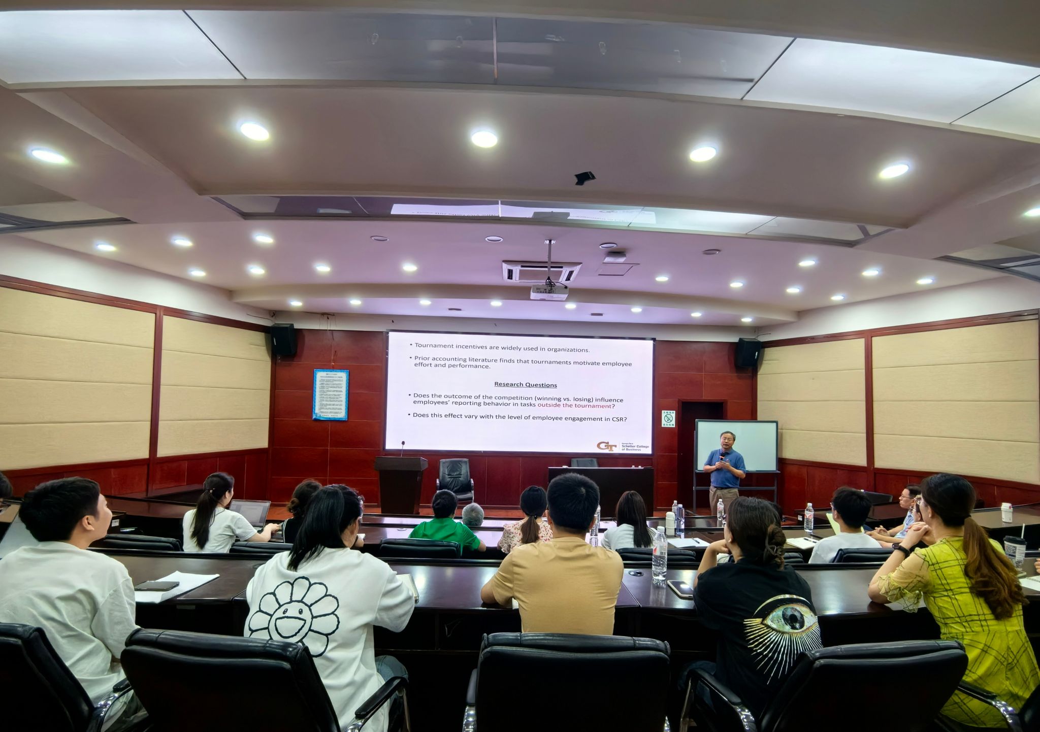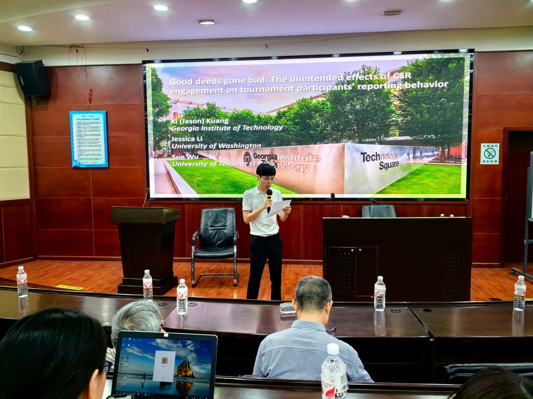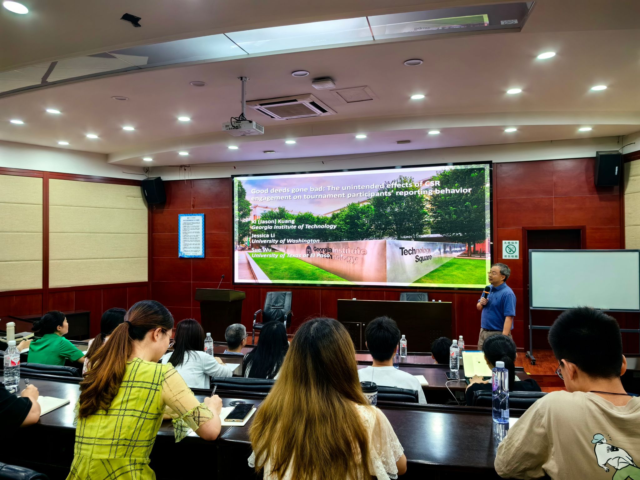 2024年6月28日下午,美国佐治亚理工学院况熙教授应邀在英国上市365官网开展题为“Good deeds gone bad: The unintended effects of CSR engagement on tournament participants’ reporting behavior”的学术报告,副院长马锋主持了此次学术讲座,学院部分教师及研究生参加了此次活动。副院长马锋介绍了况熙教授的学术背景及研究成果,并对况熙教授的到来表示热烈的欢迎和诚挚的感谢。