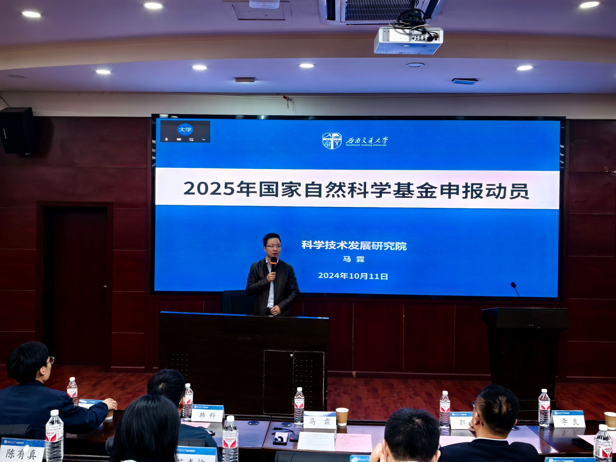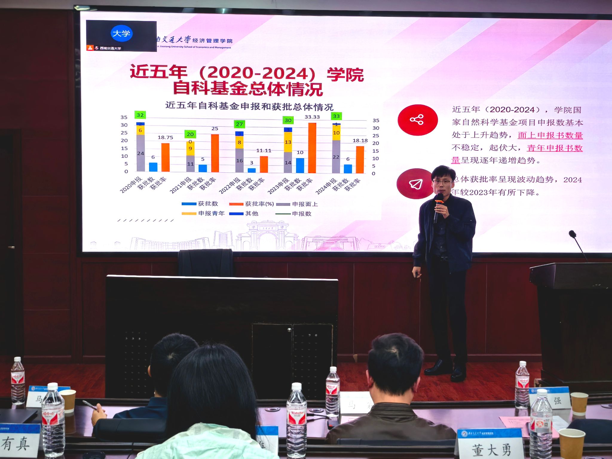 随后,科学技术发展研究院副院长马霖进行了自科基金项目申报启动宣讲。他感谢学院的邀请,并表示很高兴能参加基金项目启动会。马霖副院长鼓励全院教师在合适的时机争取基金支持,并指出了教师们在撰写自科基金申请时常见的问题,如对科学问题的凝练和对自科基金写作方法的不熟悉。他建议大家早做准备,多次打磨申报书,并积极向有经验的教师请教。马霖副院长还介绍了近五年全校基金工作的概况、2024年全校基金的阶段性总结以及2025年自然基金申报的安排。