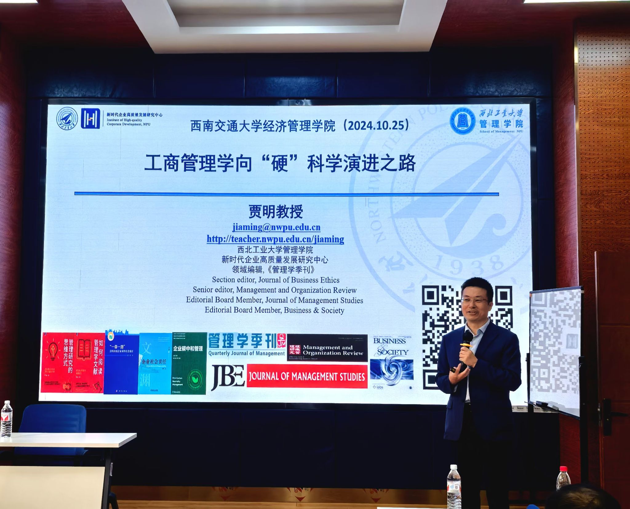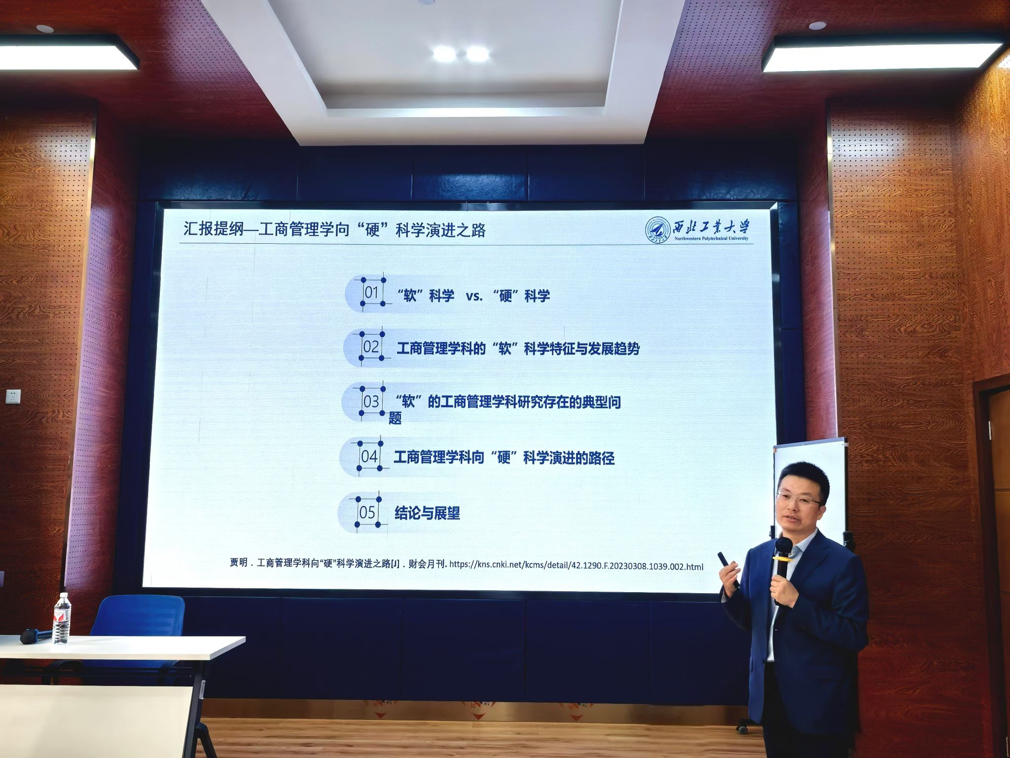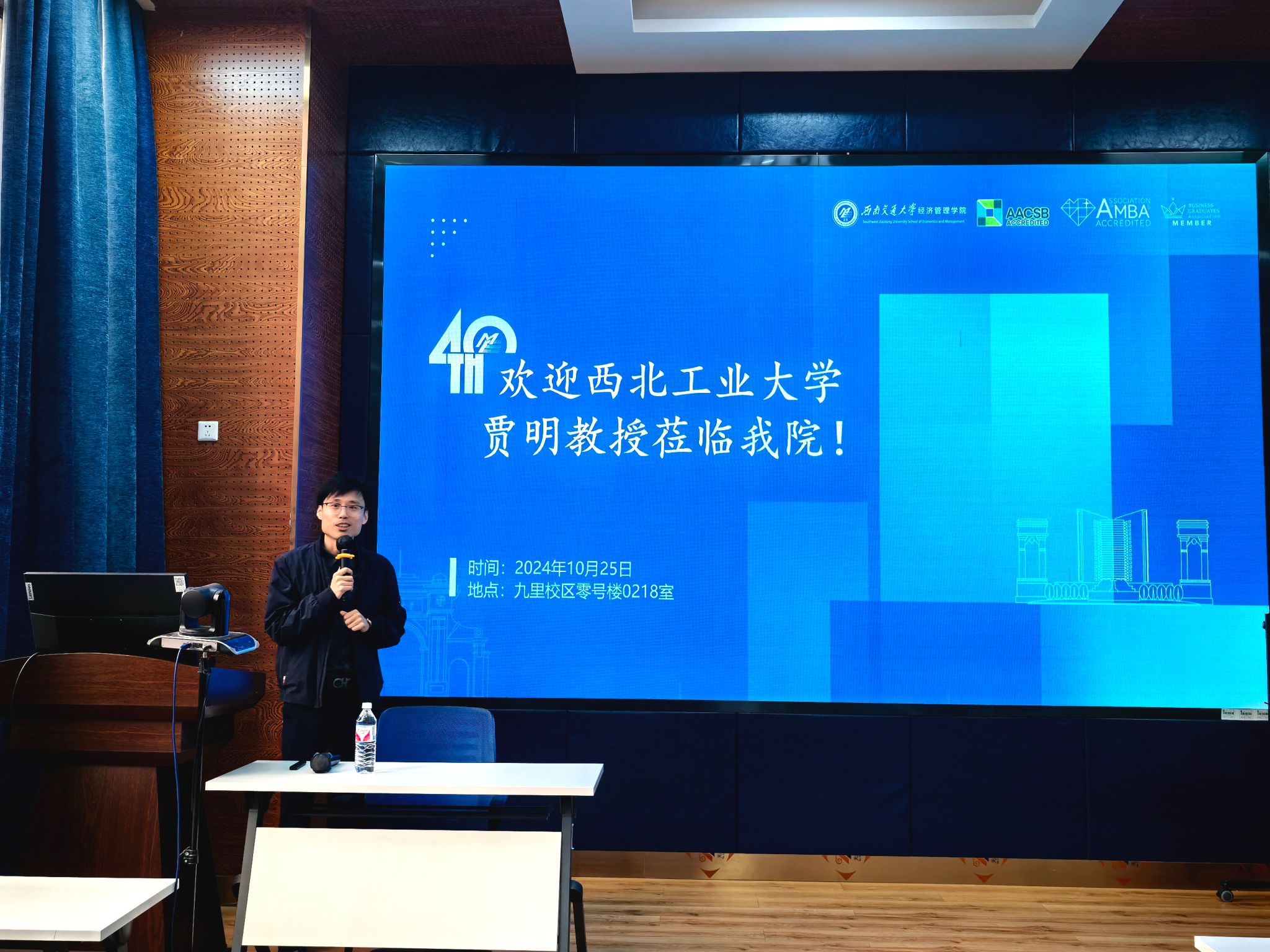 2024年10月25日下午,西北工业大学管理学院贾明教授应邀在九里校区英国上市365官网为365官网师生带来了一场聚焦于“工商管理向硬科学演进之路”的学术讲座。本次学术活动由副院长马锋主持,学院部分教师及研究生60余人参加此次活动,副院长马锋介绍贾明教授的学术背景与成就,并代表学院对贾明教授表示欢迎与诚挚的感谢。