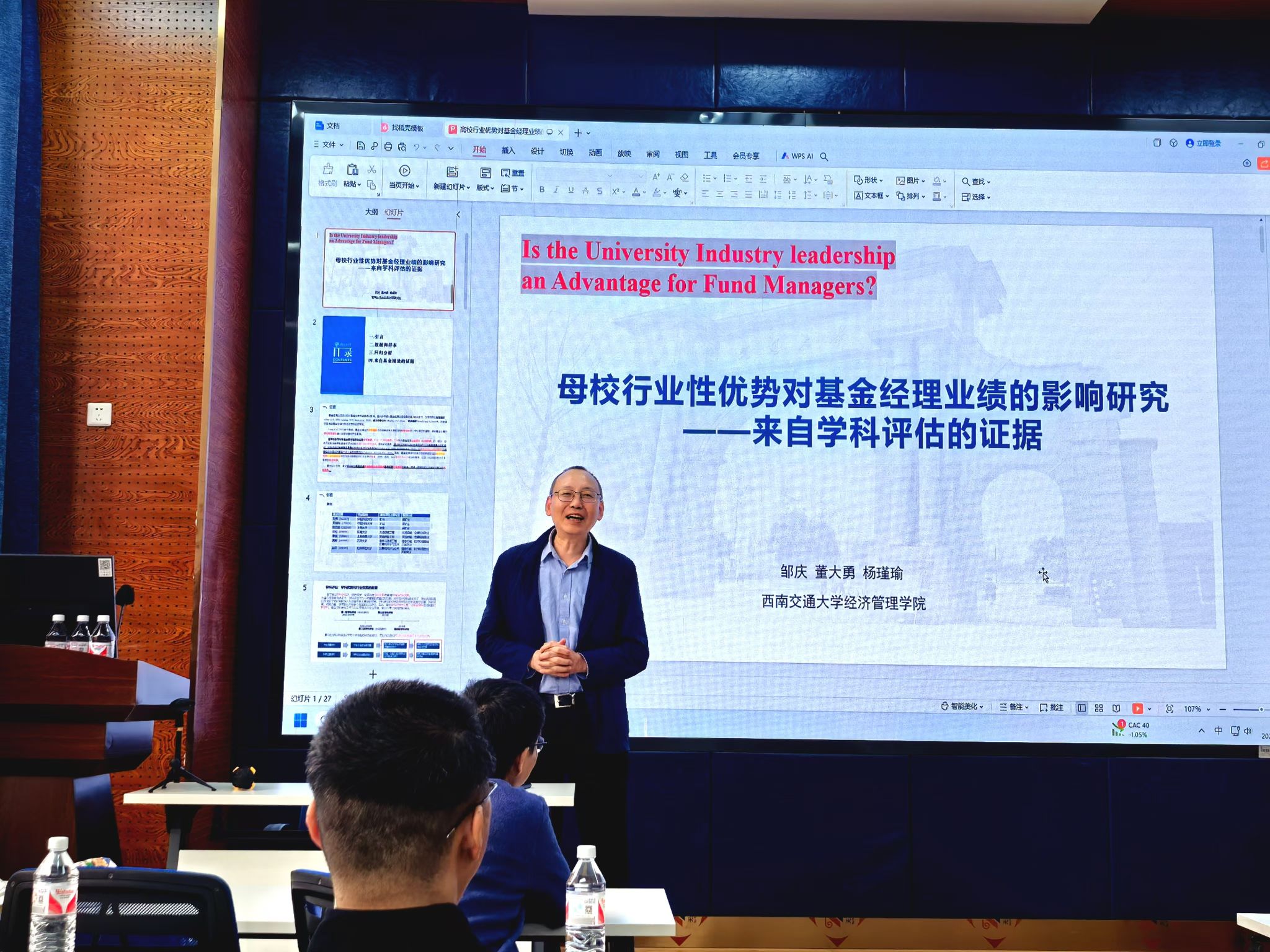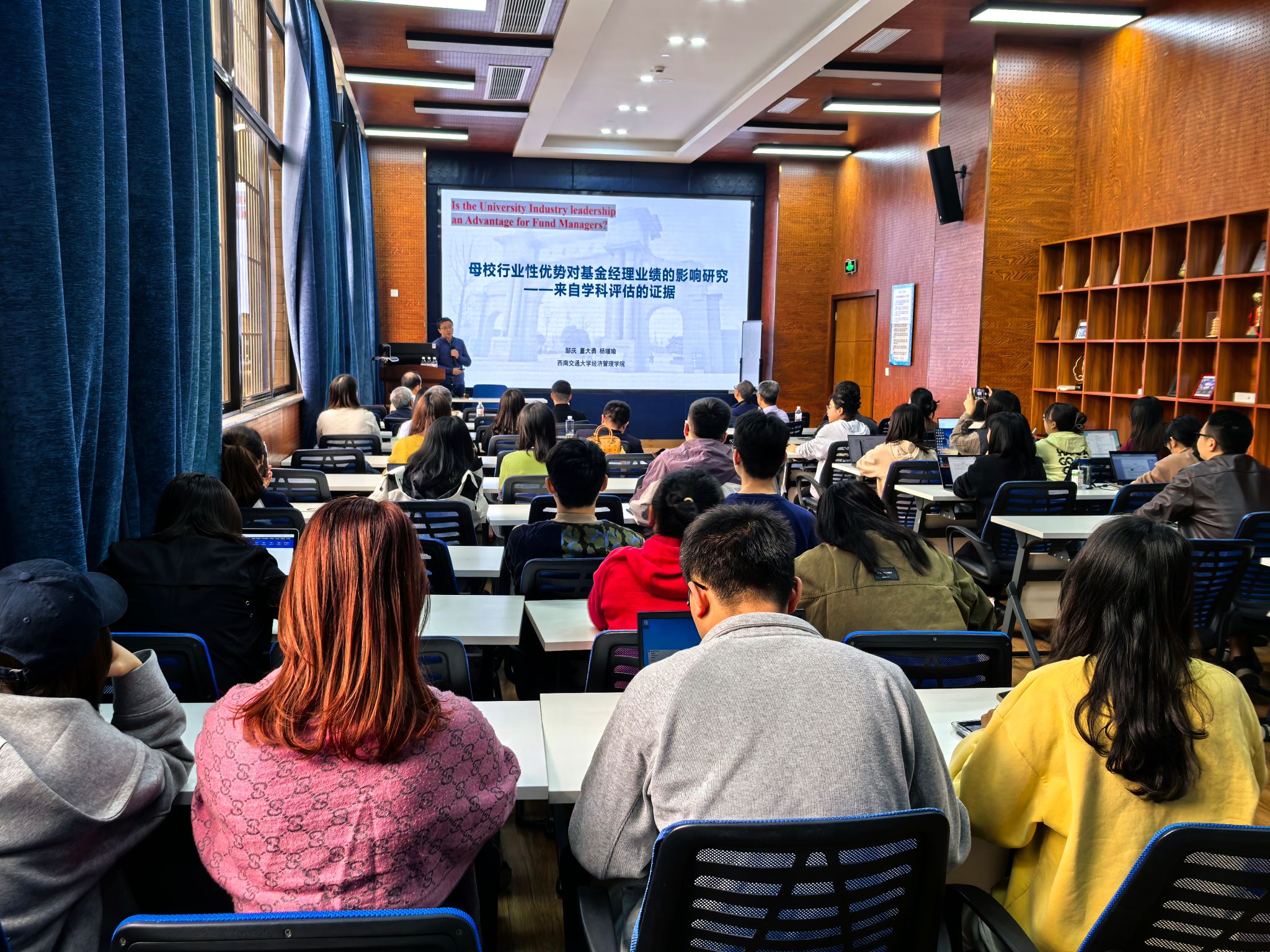 2024年11月1日,英国上市365官网九里校区零号楼0218室举办了师道永传,匠心筑梦——资深教师系列讲座。本次讲座邀请了英国上市365官网金融与财务学系的系主任董大勇教授,围绕“母校行业性优势对基金经理业绩的影响研究——来自学科评估的证据”这一主题展开,学院部分师生到场聆听,讲座由英国上市365官网副院长李良主持。