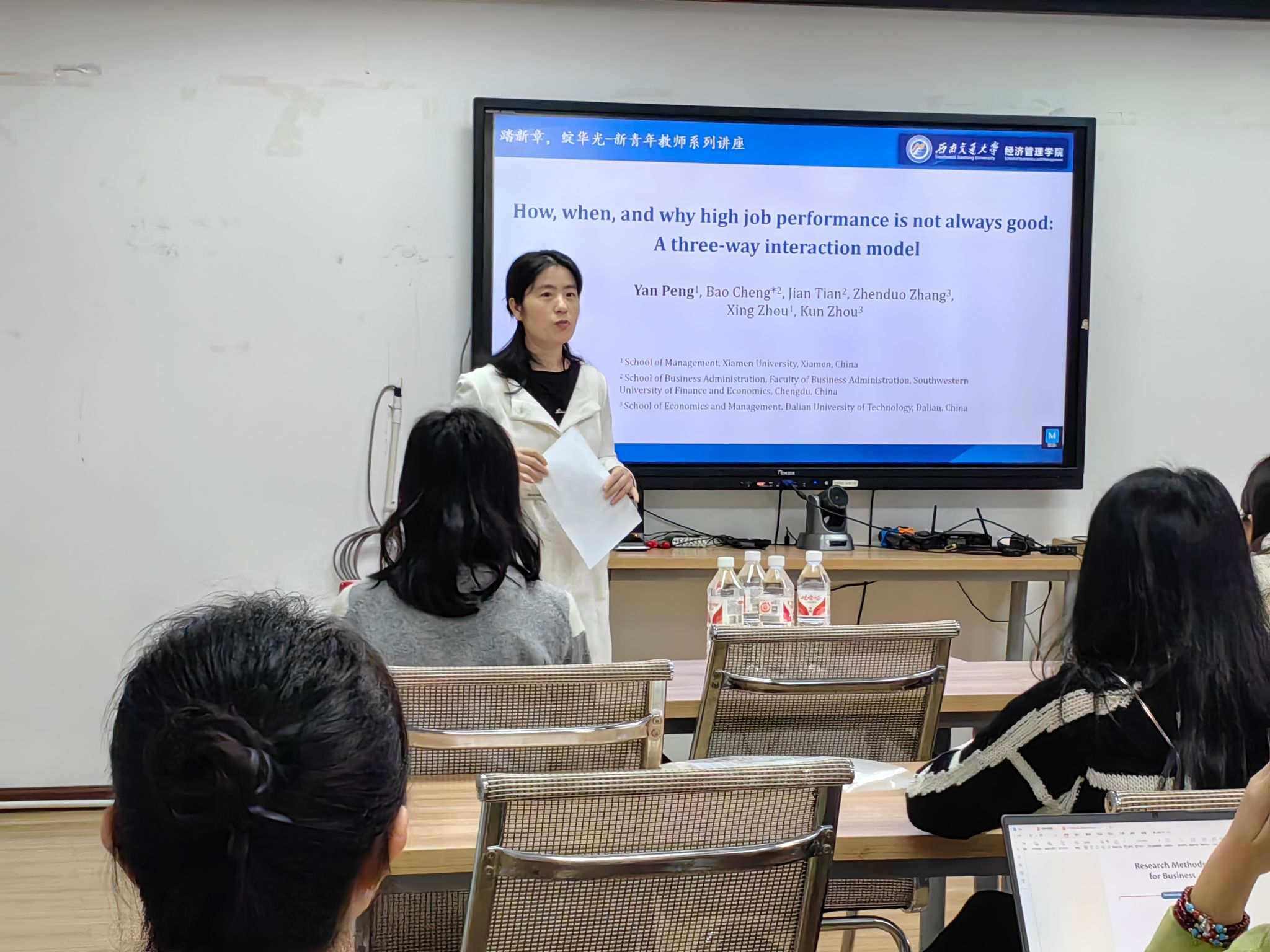 2024年11月1日,英国上市365官网九里校区零号楼0411室成功举办了新青年教师系列讲座。本次讲座邀请英国上市365官网创新创业与管理学系助理教授彭艳博士主讲,主题为“How, when, and why high job performance is not always good: A three-way interaction model”讲座吸引了学院众多硕博研究生及对组织行为学有浓厚兴趣的老师参与,由英国上市365官网市场学系副主任范春梅副教授主持。