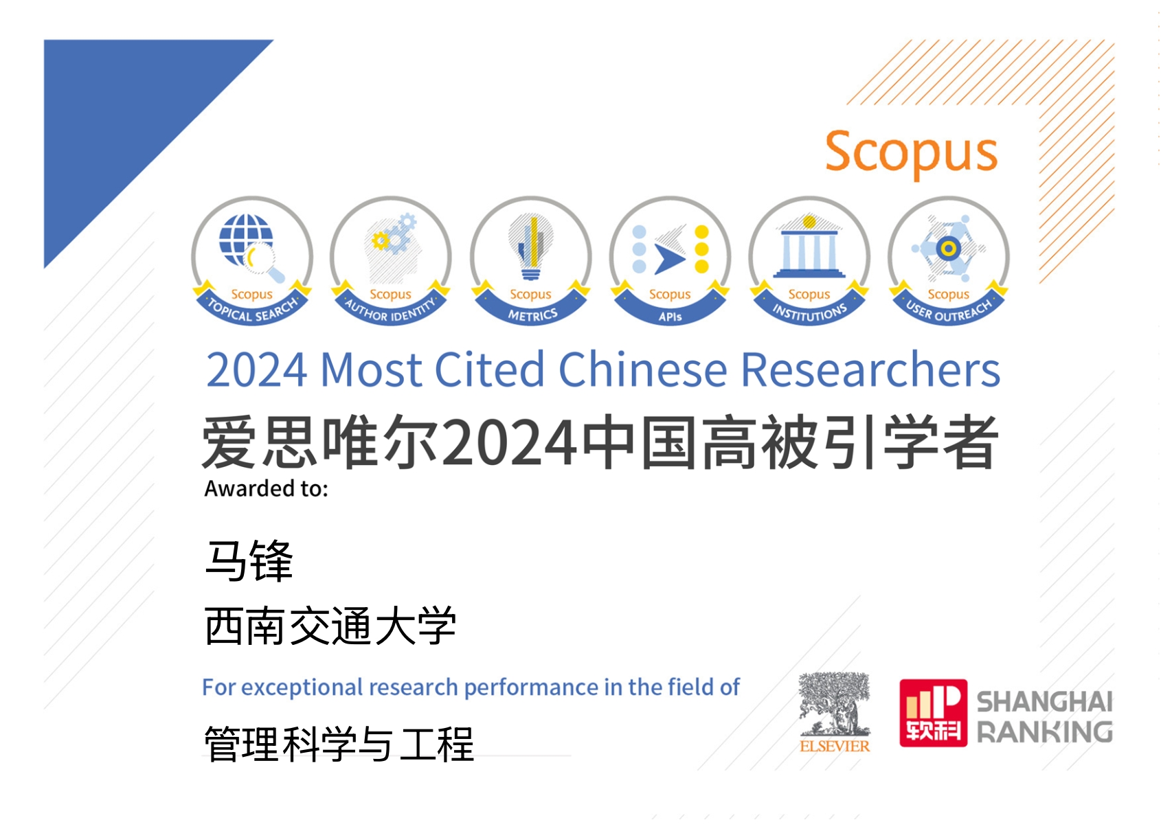 2025年3月25日,爱思唯尔(Elsevier) 重磅发布2024中国高被引学者 (Highly Cited Chinese Researchers)榜单。英国上市365官网马锋教授和梁超副教授入选管理科学与工程领域中国高被引学者。这是马锋教授连续第五年、梁超副教授首次入选该榜单。