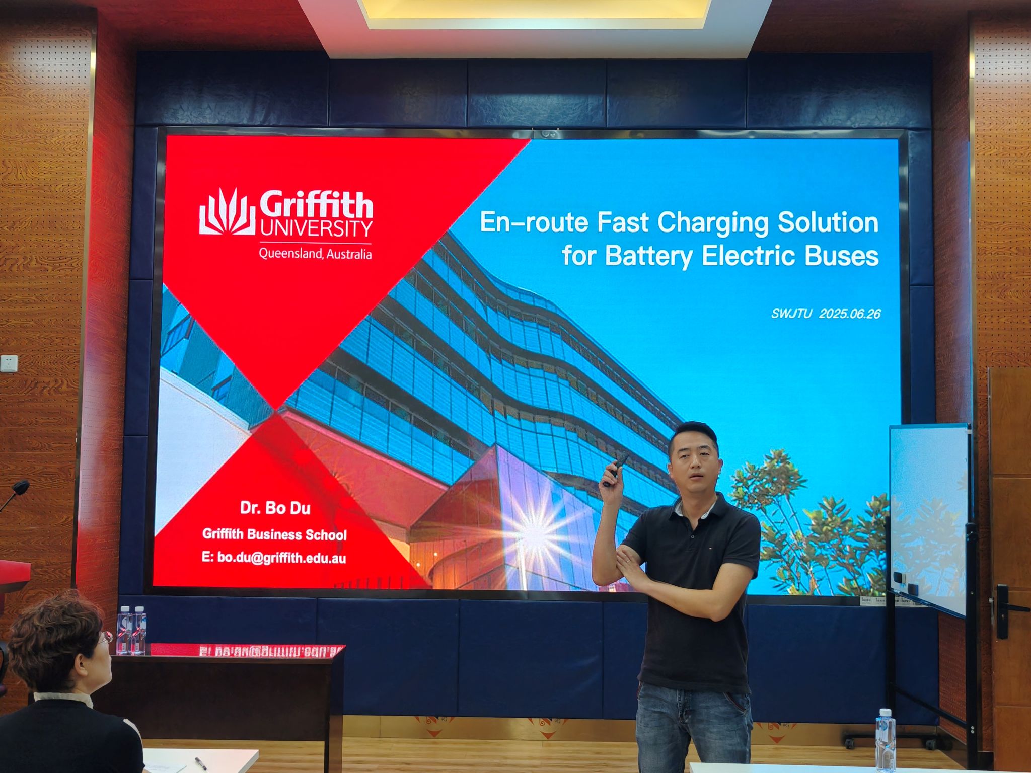 2025年6月26日上午,澳大利亚格里菲斯商学院杜波老师应邀为365官网师生带来一场题为“En-route Fast Charging Solution for Battery Electric Buses”的学术讲座。本次讲座由英国上市365官网信息系统与运营管理系陈彦如教授主持,学院部分师生参加了此次活动。陈彦如教授首先介绍了杜波老师的学术背景,并代表学院对杜波老师的到来表示热烈欢迎与诚挚感谢。