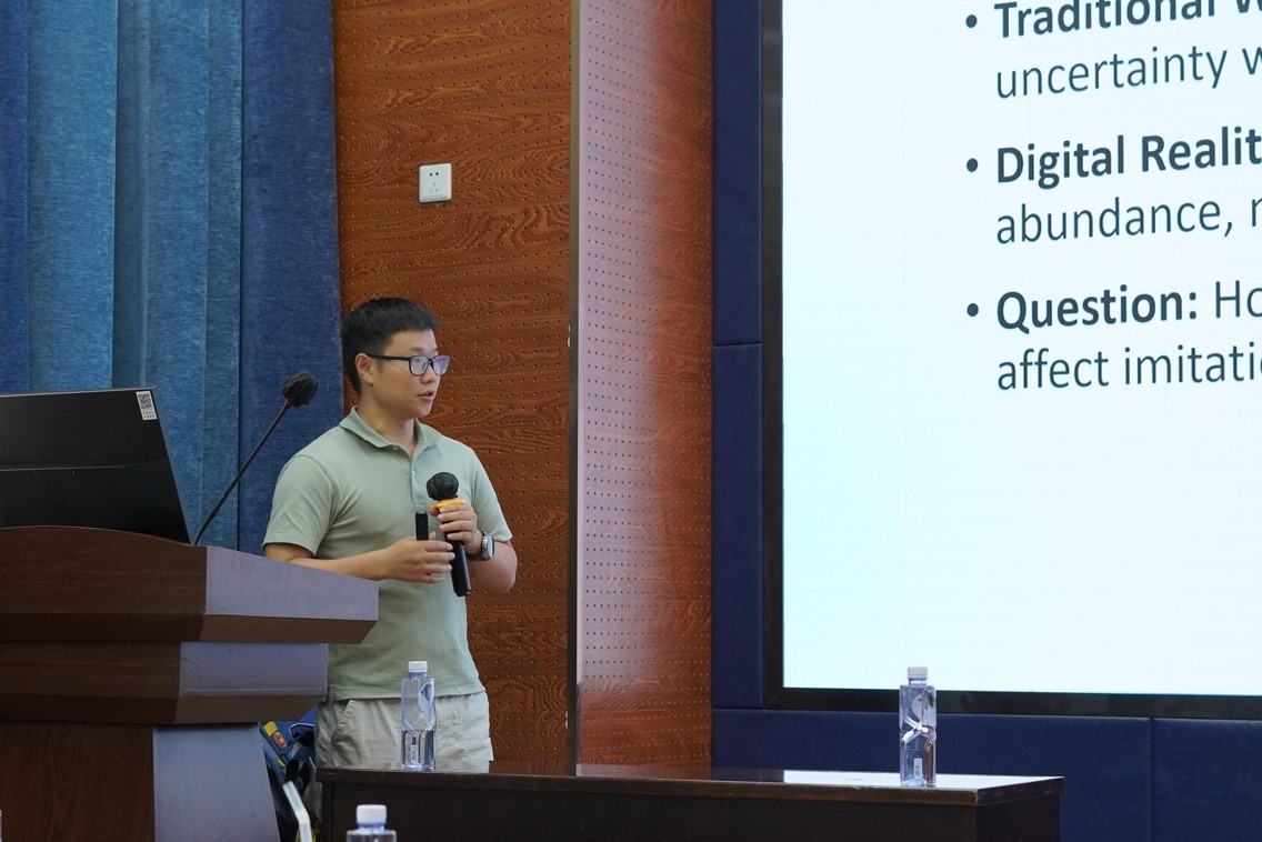 接着,王勇老师聚焦数字化转型对企业模仿行为(peer imitation)的影响展开报告。他指出,传统研究忽视企业能动性,而数字化通过扩展信息感知宽度、改变决策标准与提升注意力参与度,重塑了企业的模仿机制。研究结合组织惰性与行业竞争边界,为模仿理论在数字时代的演进提出框架。