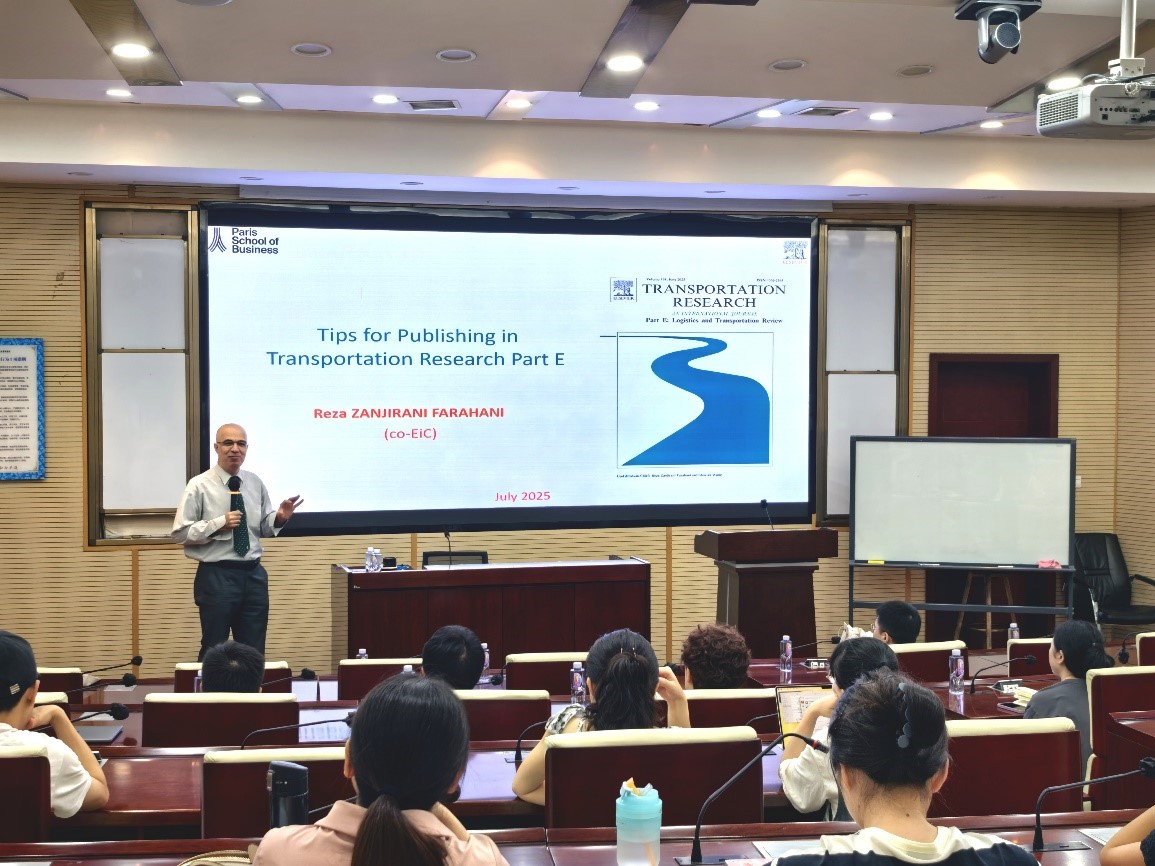 2025年7月4日上午在九里校区零号楼0204室,学院特邀Transportation Research Part E (TR-E)主编、法国巴黎商学院Reza Zanjirani Farahani教授做题为“Publishing in Top-Tier Journals: From General Principles to Transportation Research Part E (TR-E)”的学术讲座。讲座由英国上市365官网院长韩科教授主持。韩科院长首先向Reza教授介绍英国上市365官网和英国上市365官网的概况,然后向与会师生介绍Reza教授的学术背景与成就,并对Reza教授的到来表示热烈欢迎。
