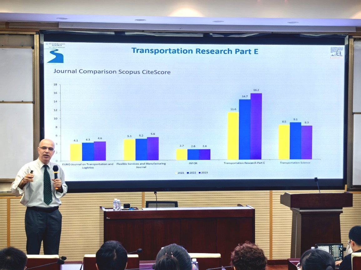 讲座聚焦于“如何在顶级期刊成功发表论文”这一议题。Reza教授首先结合自身担任主编的经验,深度剖析了物流与运输领域旗舰期刊Transportation Research Part E (TR-E)的审稿流程、投稿要求、期刊偏好以及常见的退稿原因,为师生们提供了极具针对性的投稿策略指导,随后,他系统性地分享了在权威期刊发表论文的通用原则与实用技巧,内容涵盖研究选题、贡献定位、论文结构设计以及如何契合期刊编辑标准等关键环节。他强调,无论是理论分析、实证研究还是跨学科工作,清晰定位研究的核心贡献并符合期刊目标是成功的关键。