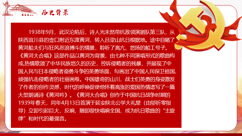 姚宇淇说道:“在中华民族最艰苦的抗战相持阶段,一方面,国民政府首都早已南迁至重庆,并酝酿着反共摩擦,抗日民族统一战线面临着被瓦解的危险;另一方面,汪精卫于1938年12月公开投敌,一时间中国再战必败等亡国论在中华大地频繁出现,使一部分人对持久抗战产生了动摇。在这个重要的时刻,由诗人光未然作词,冼星海作曲的一部交响乐代表作——《黄河大合唱》诞生了!这首歌代表着整个中华民族团结一致宁死不屈的伟大精神,是属于这个时代的中华儿女的战歌!”