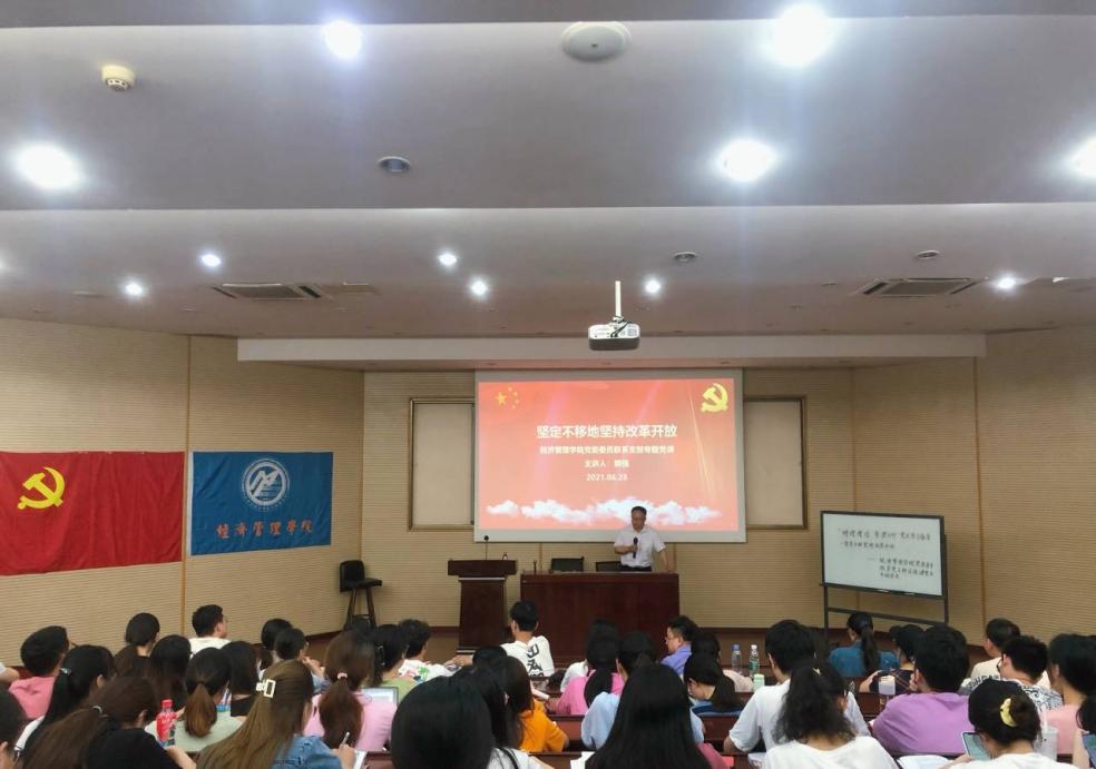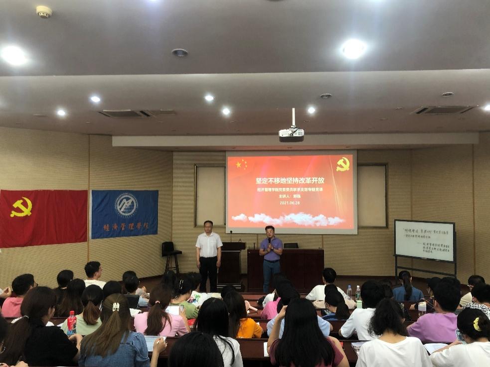 2021年6月28日晚,在0202教室,英国上市365官网执行院长郭强同志以“坚定不移地坚持改革开放”为主题,讲授了庆祝建党百年专题微党课。参加本次党课的有学院本科经贸类党支部成员、2018级博士党支部和工程管理系教工支部成员。