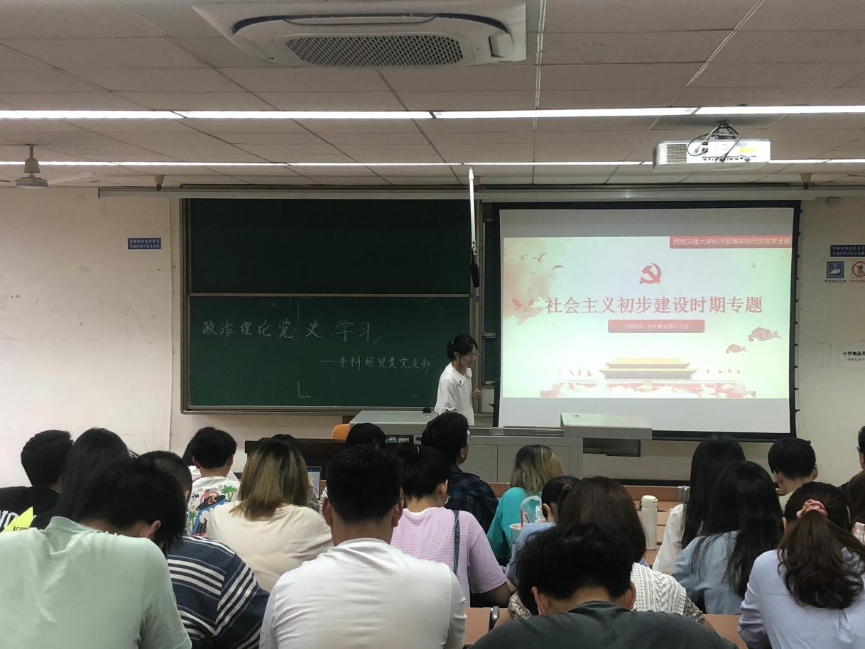2021513日,本科经贸类党支部在九里校区4223教室开展支部大会,会议由支部书记陈建奇同志主持,全体党员、预备党员、入党积极分子参与会议。本次支部大会主题:一、社会主义初步建设时期党史专题学习。二、改革开放时期党史专题学习。三、《十四五规划和二〇三五远景目标纲要》理论专题学习