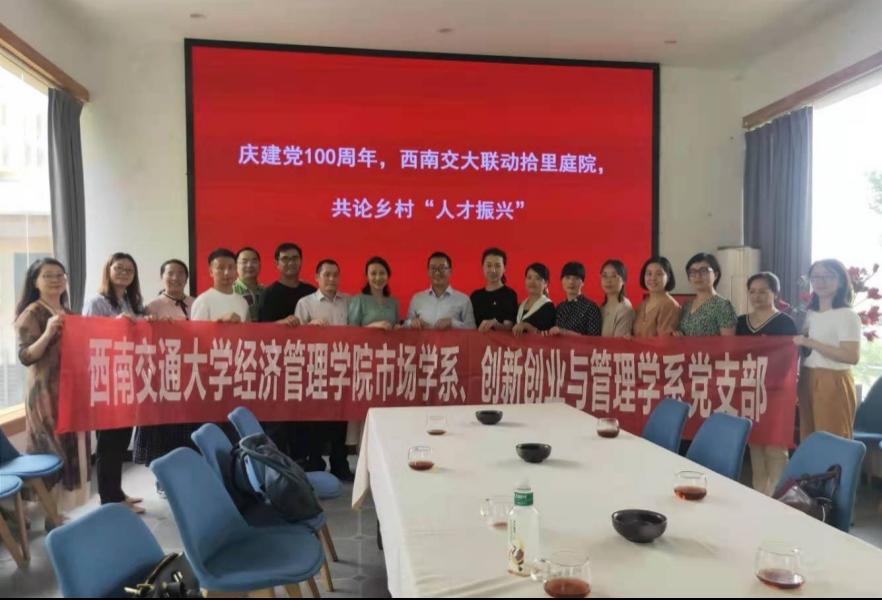 在中国共产党成立一百周年之际,为贯彻“学党史、悟思想、办实事、开新局”的党史学习教育主题,提升党史学习成效,英国上市365官网市场学系、创新创业与管理学系党支部于6月10日来到新都区新繁街道汪家村,走进四川源素轻旅文旅科技集团,联合开展院企合作特色党建活动暨乡村振兴研讨会。市场学系、创新创业与管理学系党支部一行16名教师参加了本次活动。四川源素轻旅文旅科技集团的三位创始人董事长李彪、人力资源总监李欣、直营主管李中丽参加了此次活动。